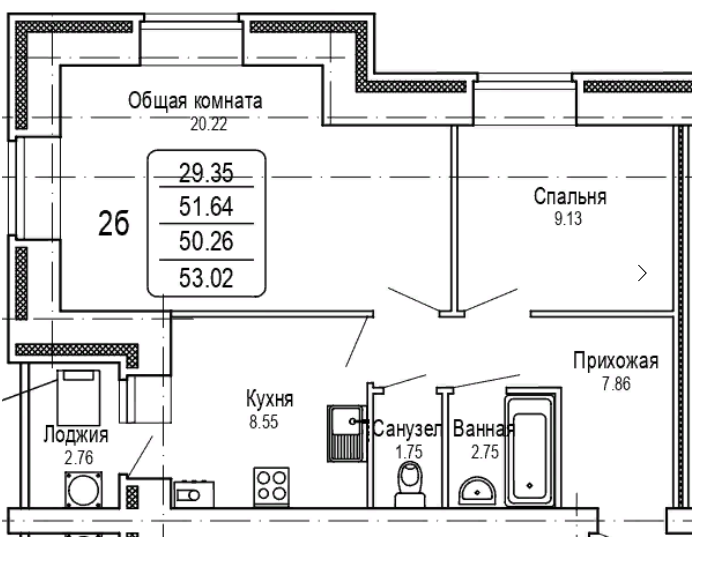 Общая площадь 53.02 м2