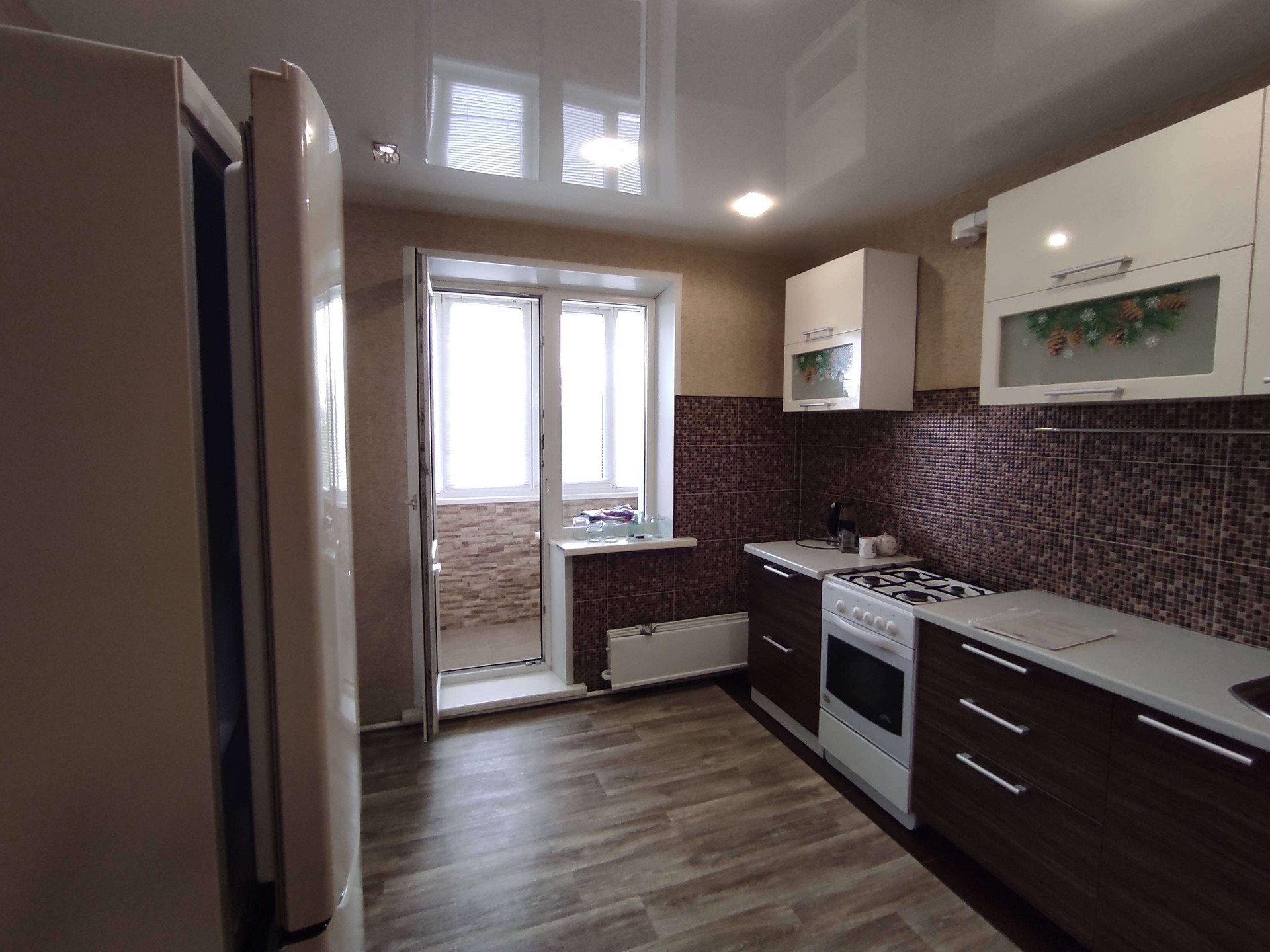 Окна пластиковые, напольное покрытие - ламинат. Интересный дизайн потолка в спальне и гостиной, выполнен в два уровня. В кухонной зоне - натяжной потолок. Лоджия в этой квартире занимает особое место - выполнена отделка из декоративных кирпичей, превращая ее в отельную уютную комнату. Санузел в кафеле, подведена стиральная машина.