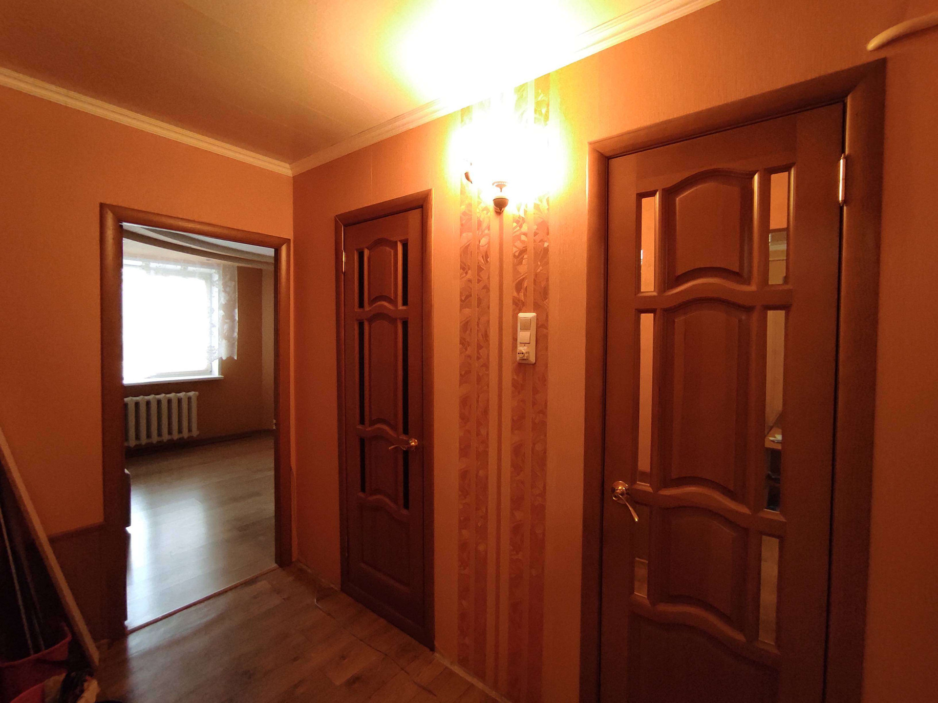 Окна выходят во двор. Дизайн квартиры выполнен в едином стиле, создавая уют.