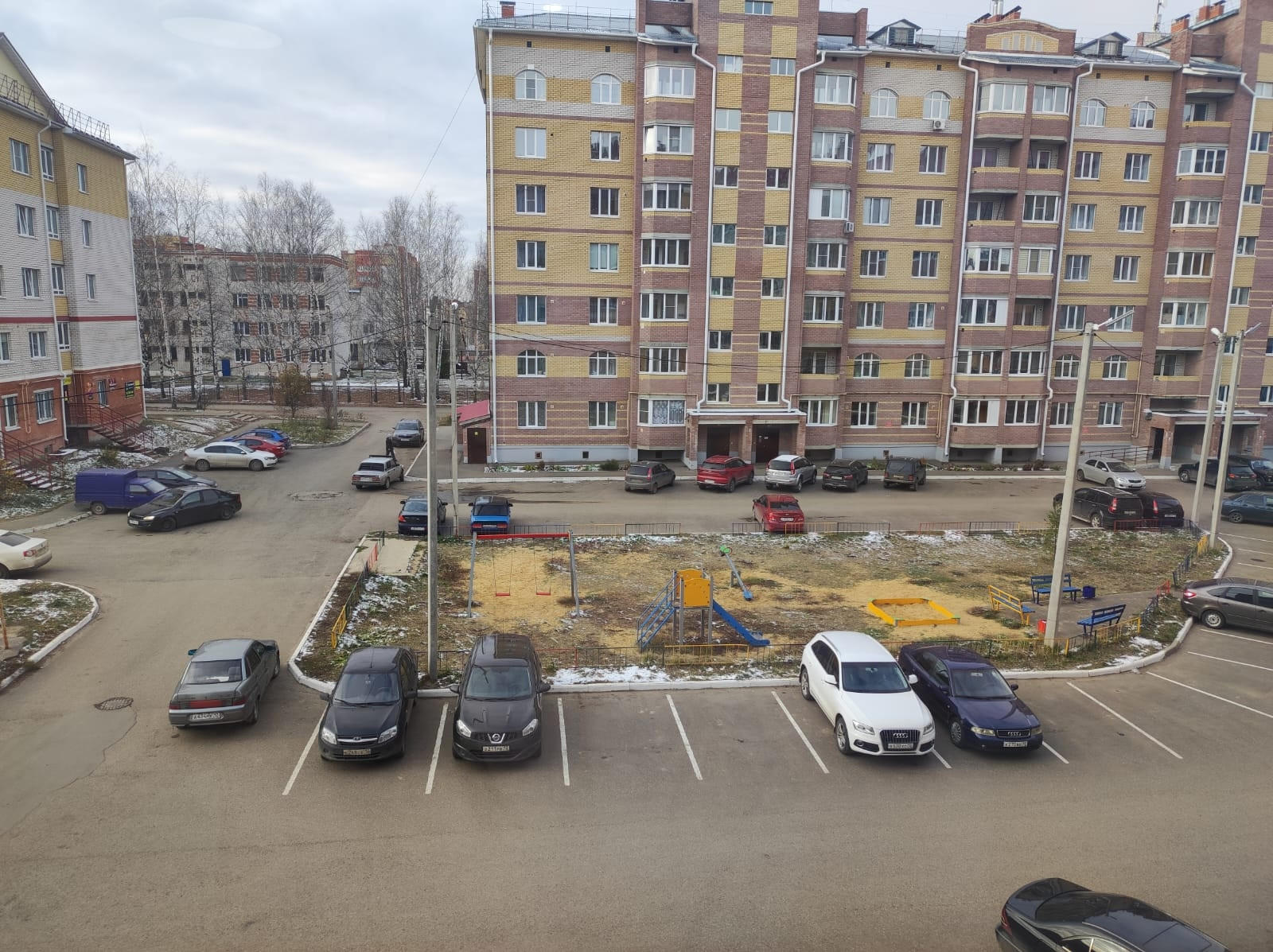 Окна выходят во двор, обзор площадки и парковки.