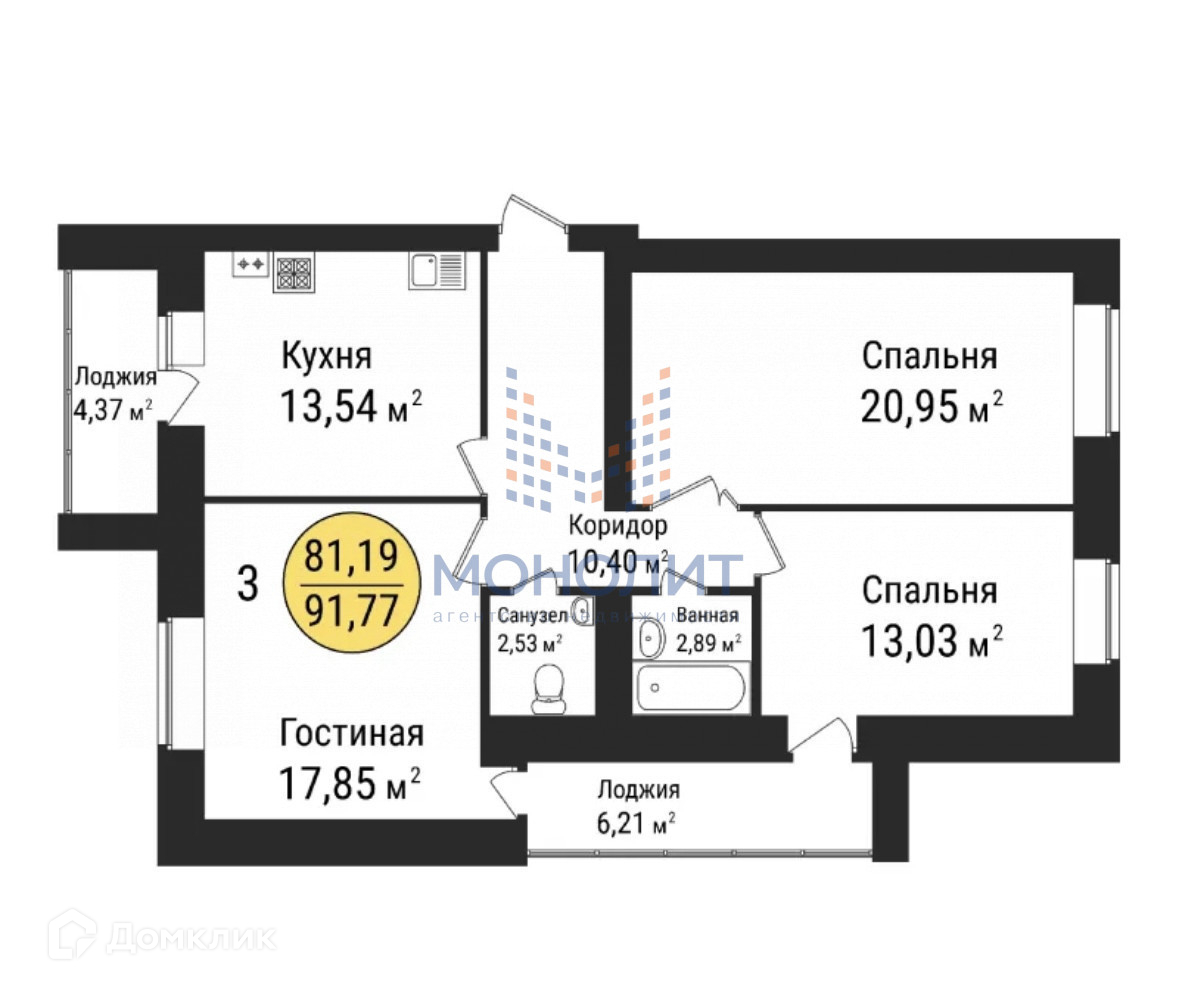 Общая площадь 91.77 м2