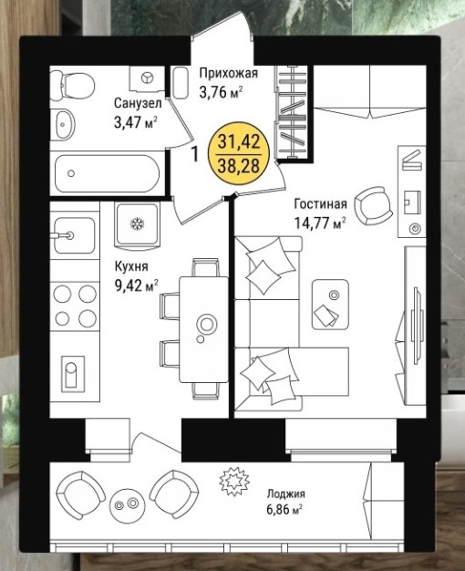 Общая площадь 38 м2
