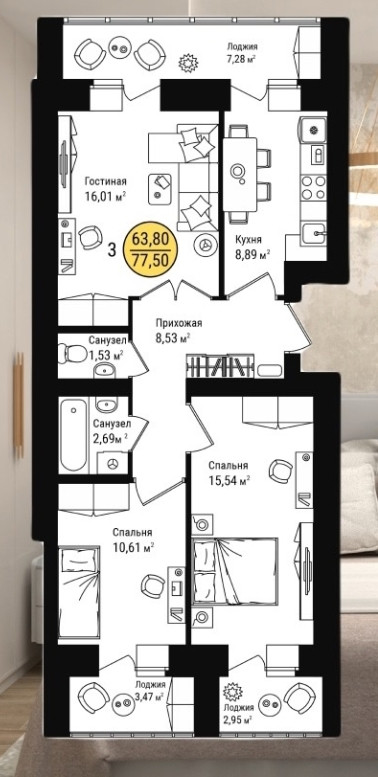 В комплексе представлены 1-, 2- и 3-комнатные квартиры различных планировок.