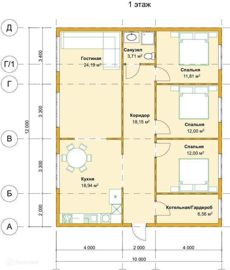 Планировка: 3 жилые комнаты (12+12+11,81 м2), гостиная (24,19 м2), кухня (19 м2).