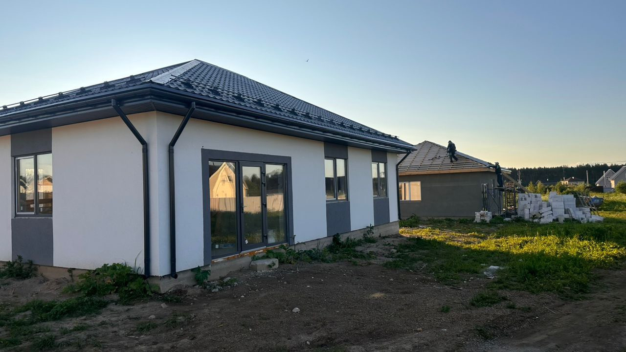 Кровля металлочерепица Grand line. Водосточная система ПВХ Docke. Подшив карниза выполнен из ламинированых софитов. Утепление Кровли выполнено базальтовой ватой толщиной 200мм.