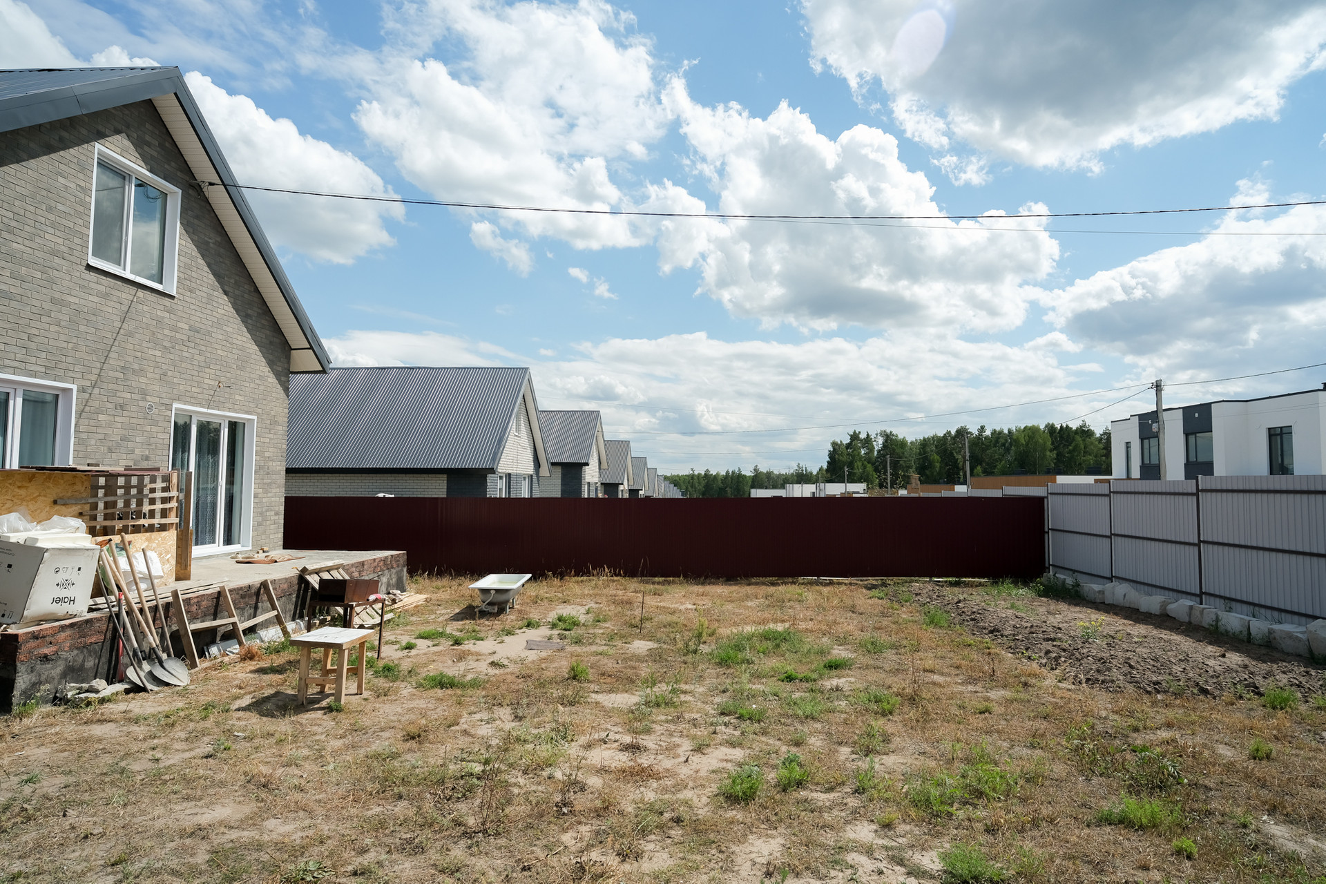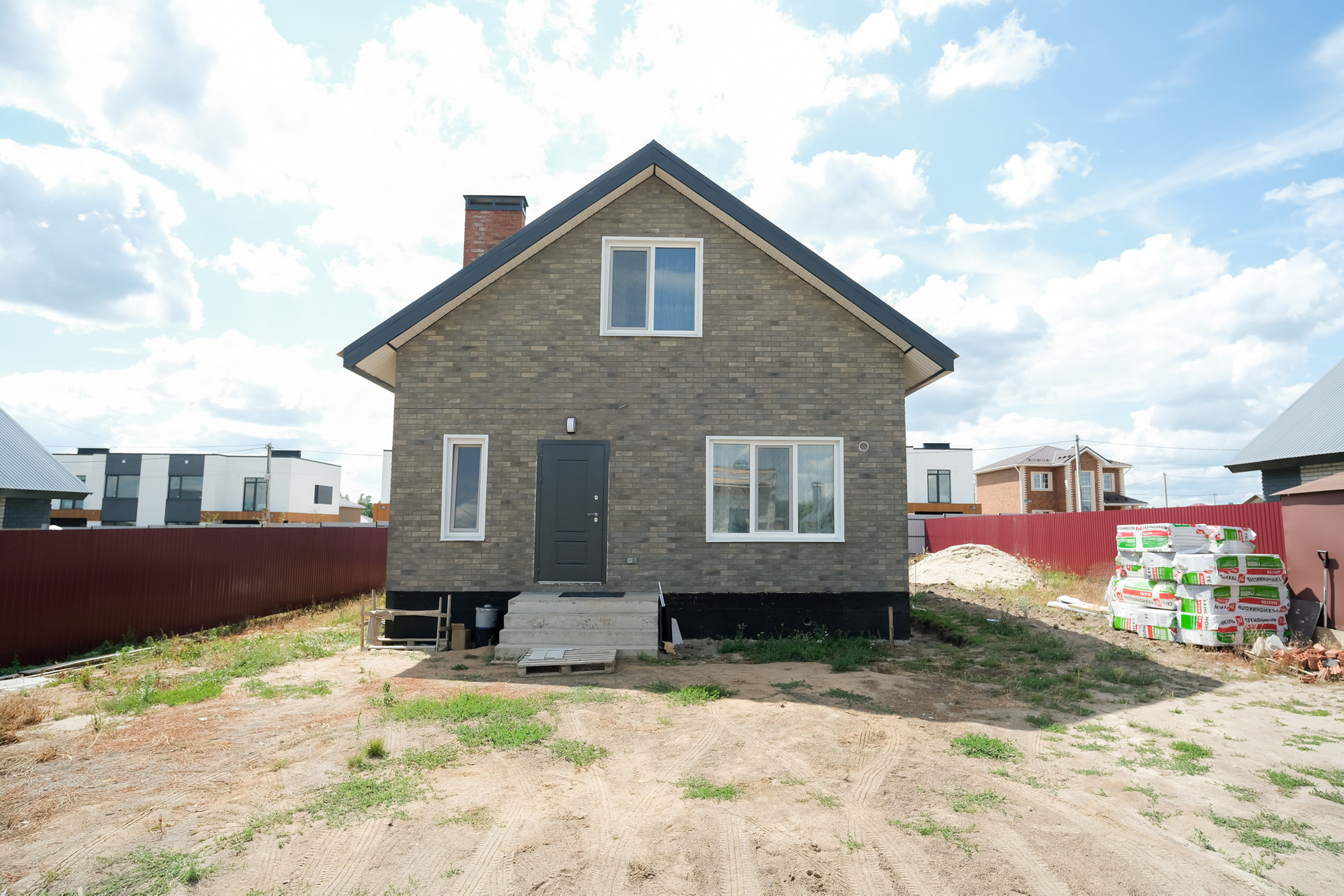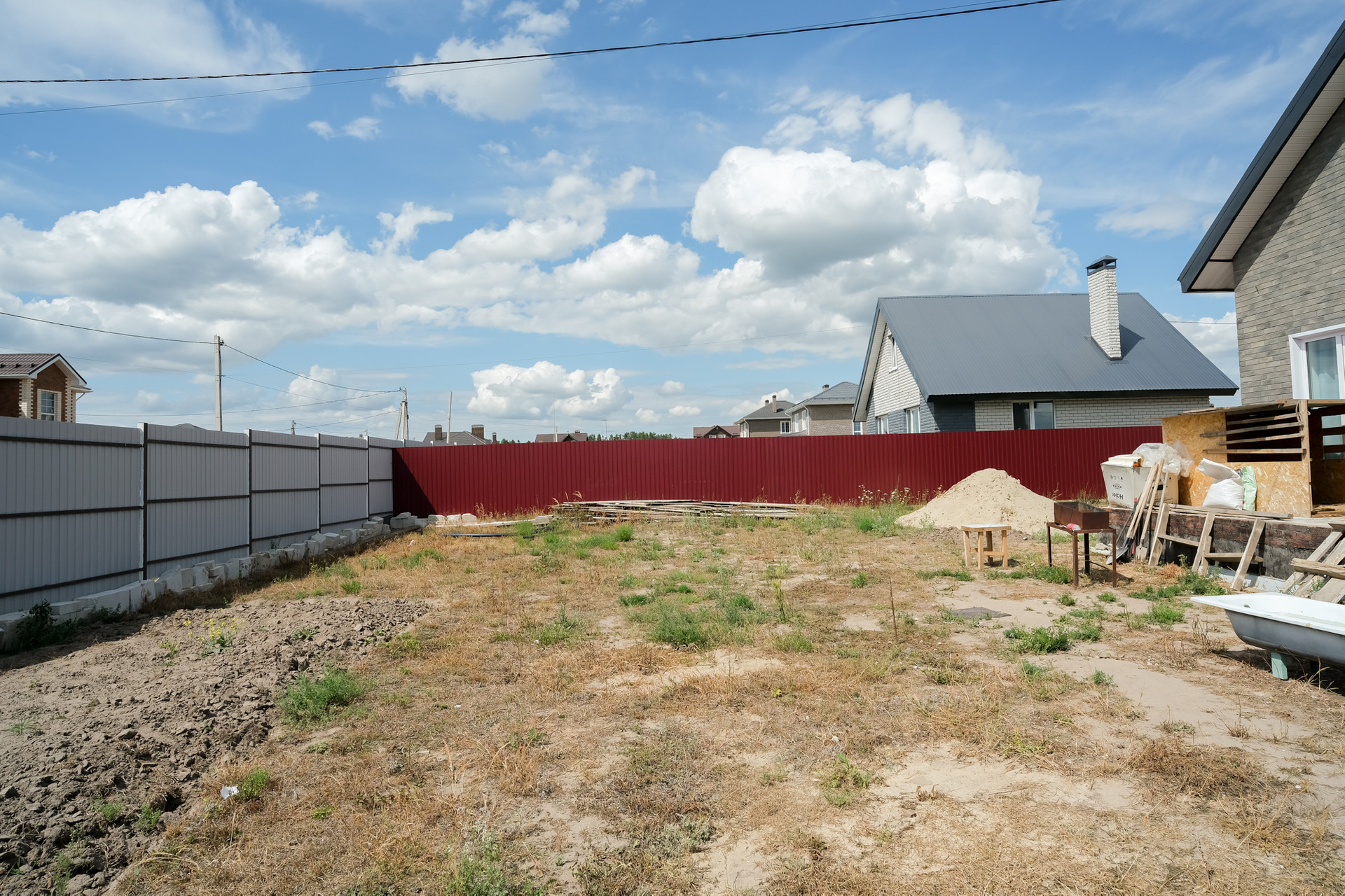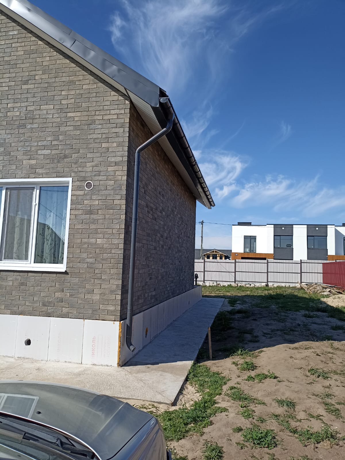 Участок ровный, прямоугольной формы, 20*30 метров. С тех сторон огорожен 2х метровым крашенным профлистом, что сэкономит ваш бюджет минимум на 200 т.р. Так же по периметру дома залита отмостка и установлены водостоки. Залита и подготовлена плита для терассы. На нее два выхода. Один из гостинной, второй из кухни.
