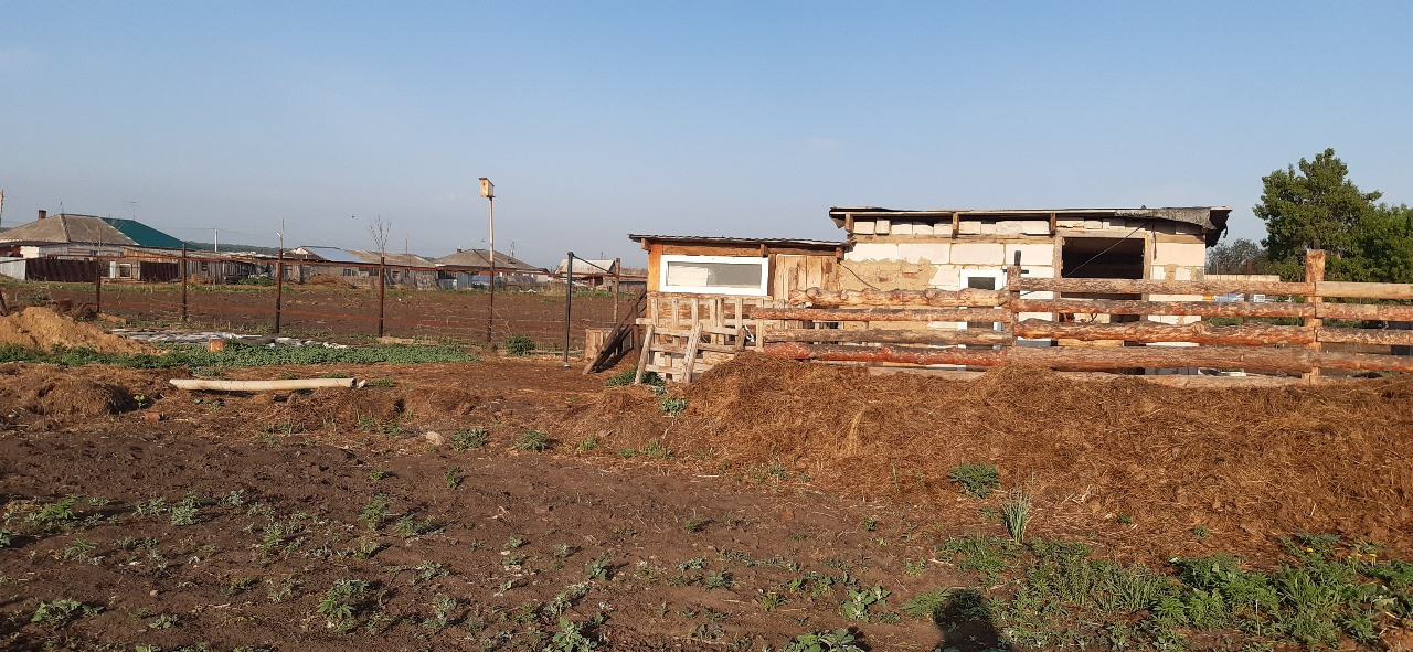 Участок обработан, много посадок. Гараж, большая стайка для животных, загон, место для выпаса, река. Можно заводить коров, овец, коз и птицу.