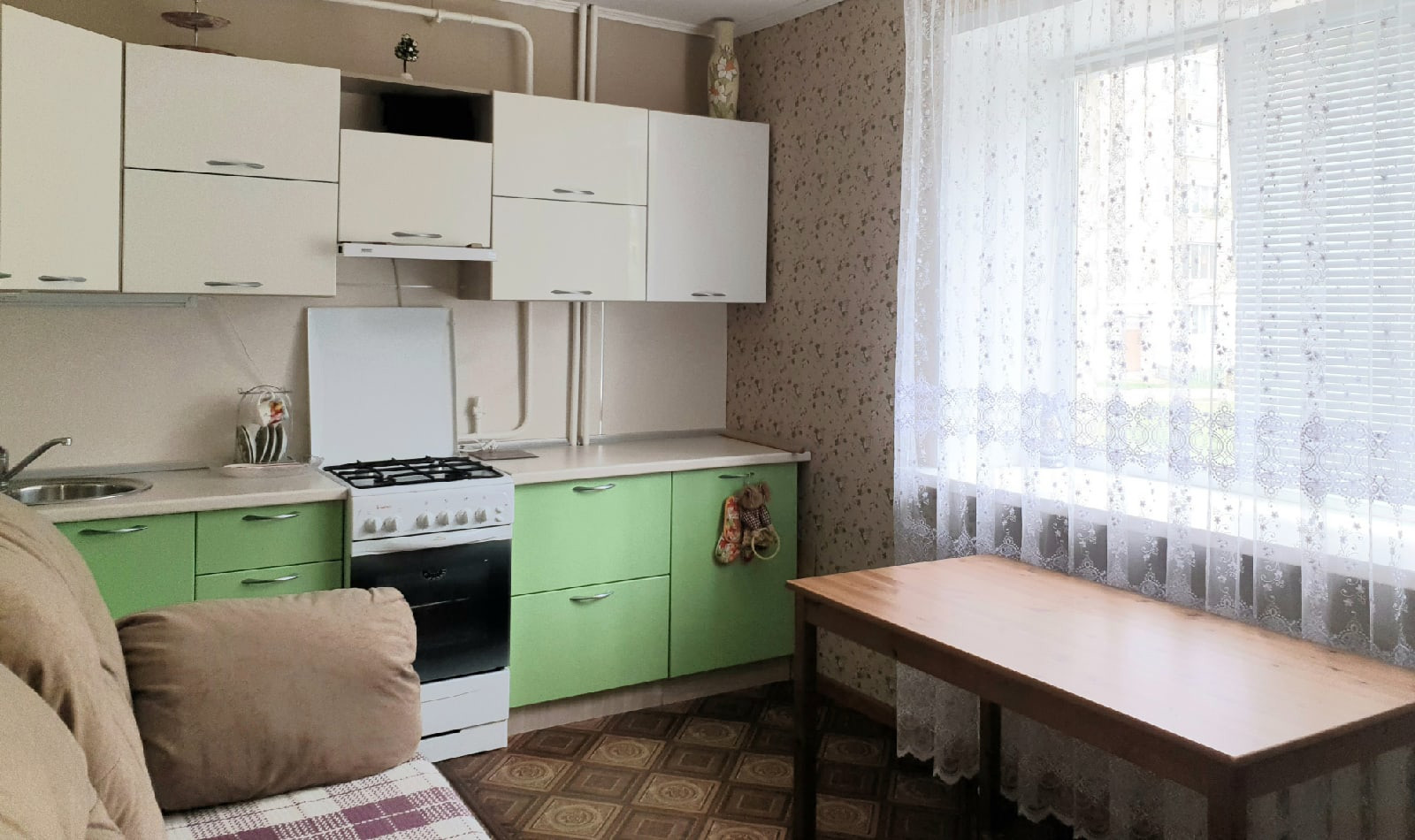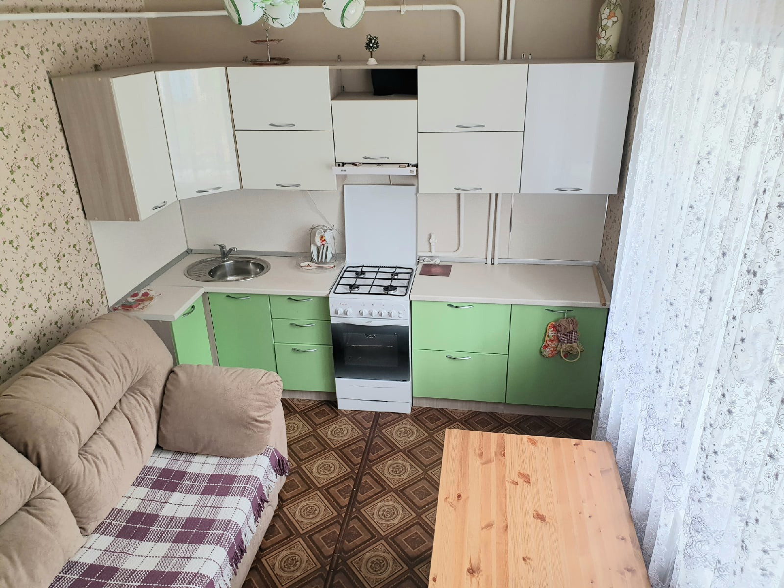 Отличная планировка!!! Просторная и светлая зона зала, большая кухня. Входная дверь металлическая, на полу линолеум отличного качества, потолки выровнены, на стенах обои нейтральных тонов, санузел совмещенный обшит пластиковыми панелями /сантехника новая/, есть кладовая, которую можно переделать в гардеробную. Установлены новые счетчики на воду, электричество. Кухонный гарнитур /газовая плита GEFEST, вытяжка/ диван, встроенный шкаф, прихожая, водонагреватель входит в стоимость квартиры. Квартира свободна от проживания, ключи можем передать в день сделки.