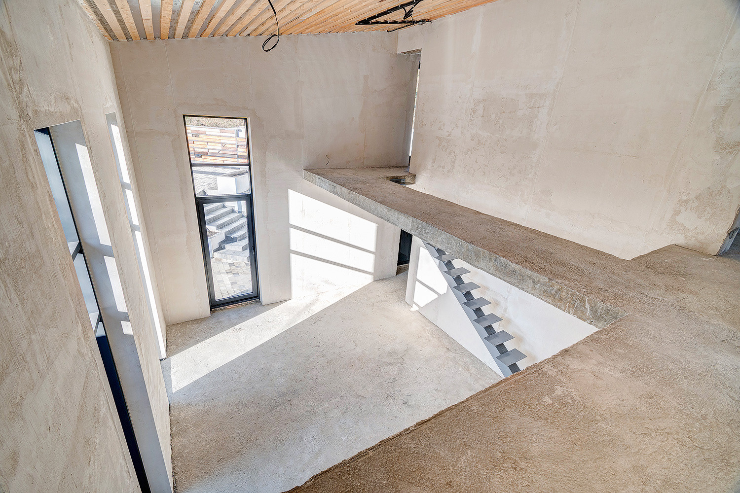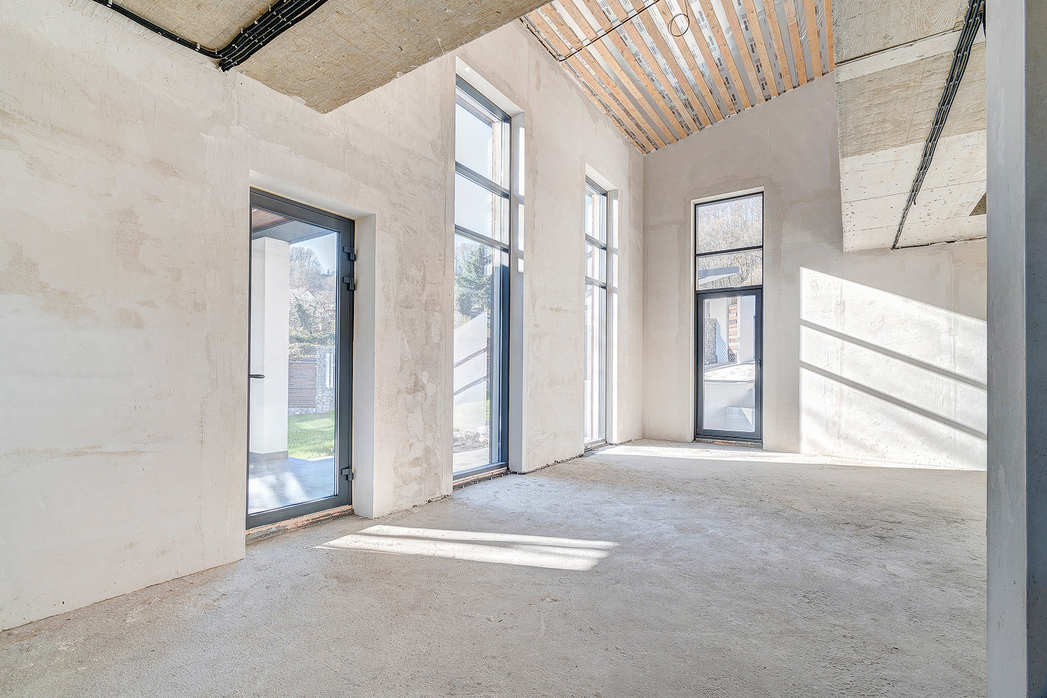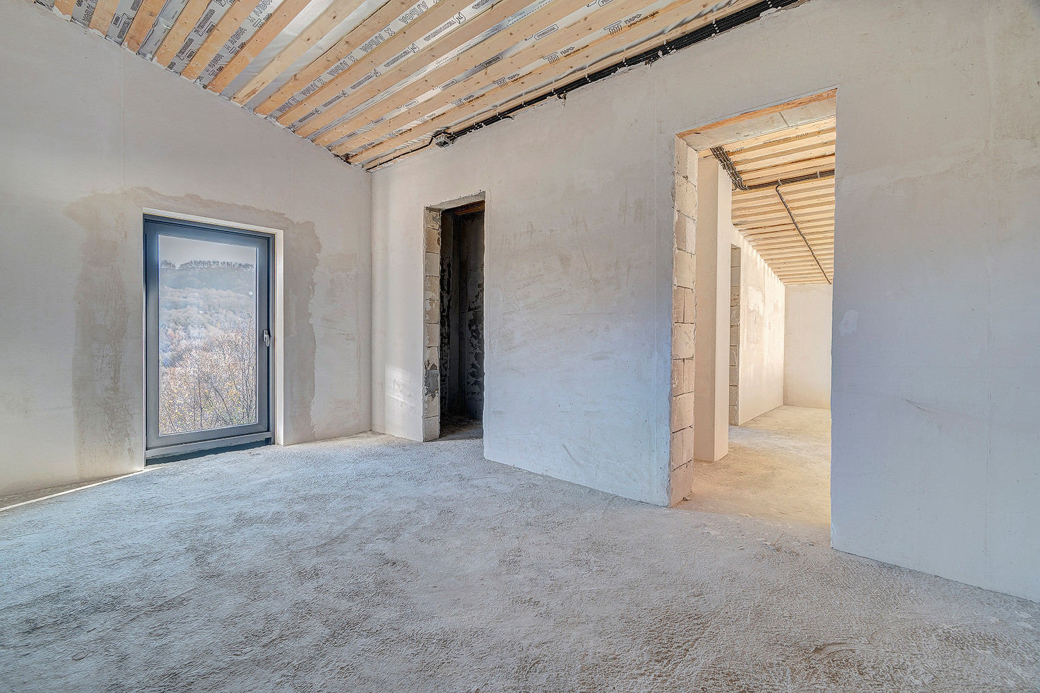 Разведена электрика, канализация, оштукатурены стены.