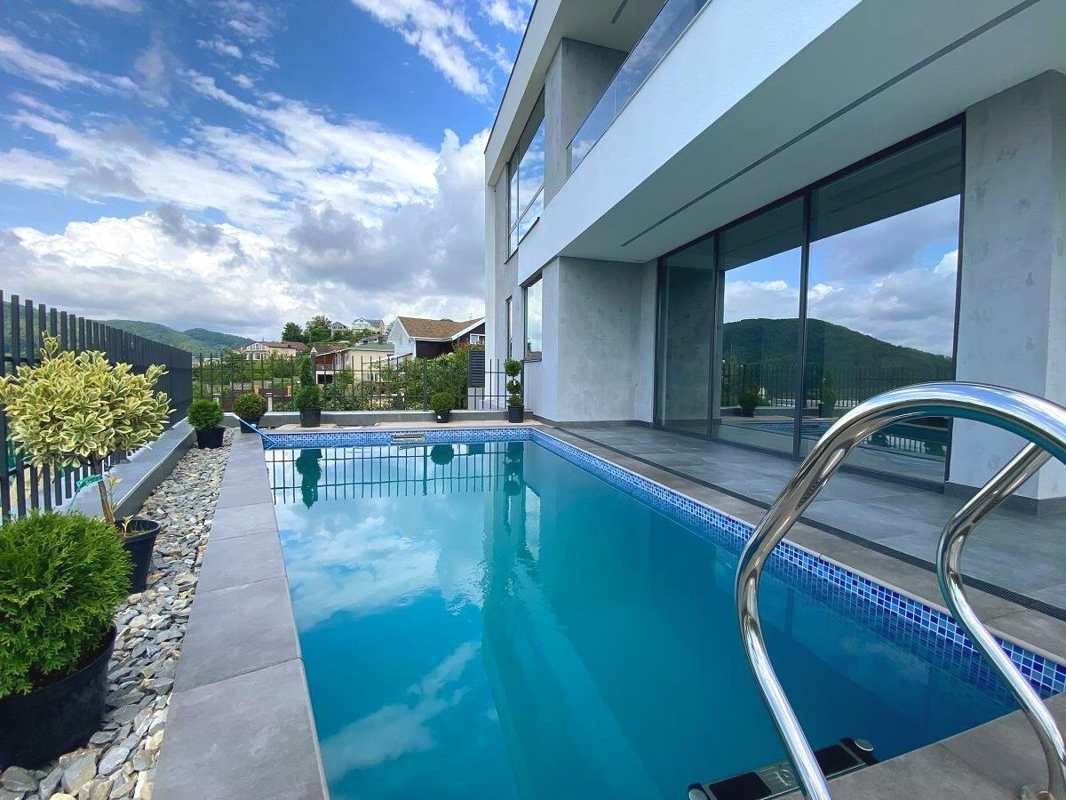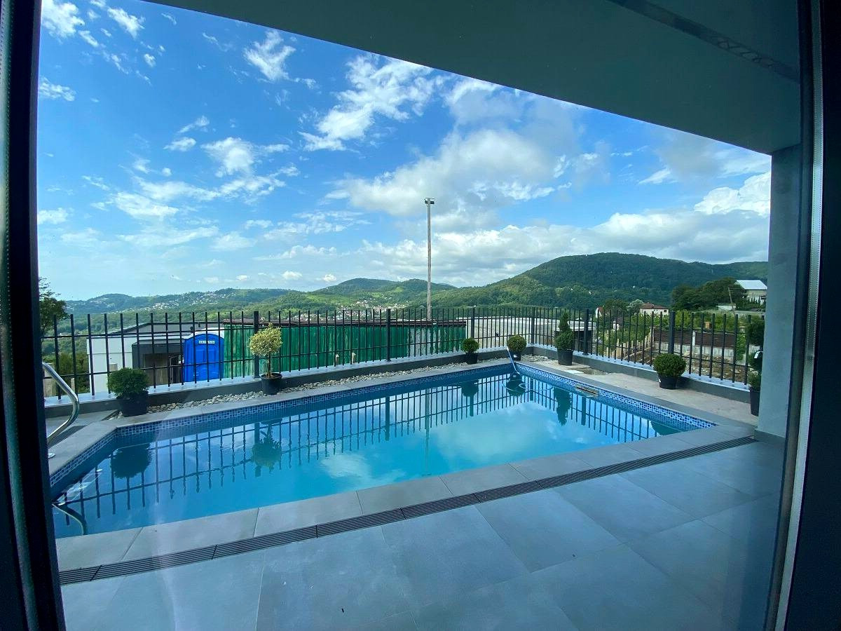 Земельный участок площадью 5 соток облагорожен, с местами для отдыха, парковкой и бассейном.