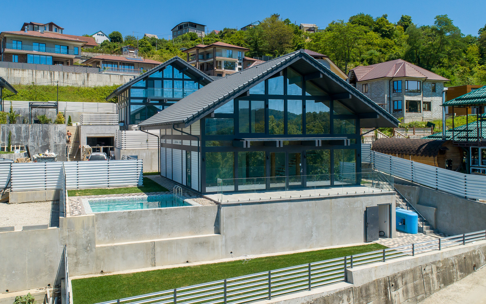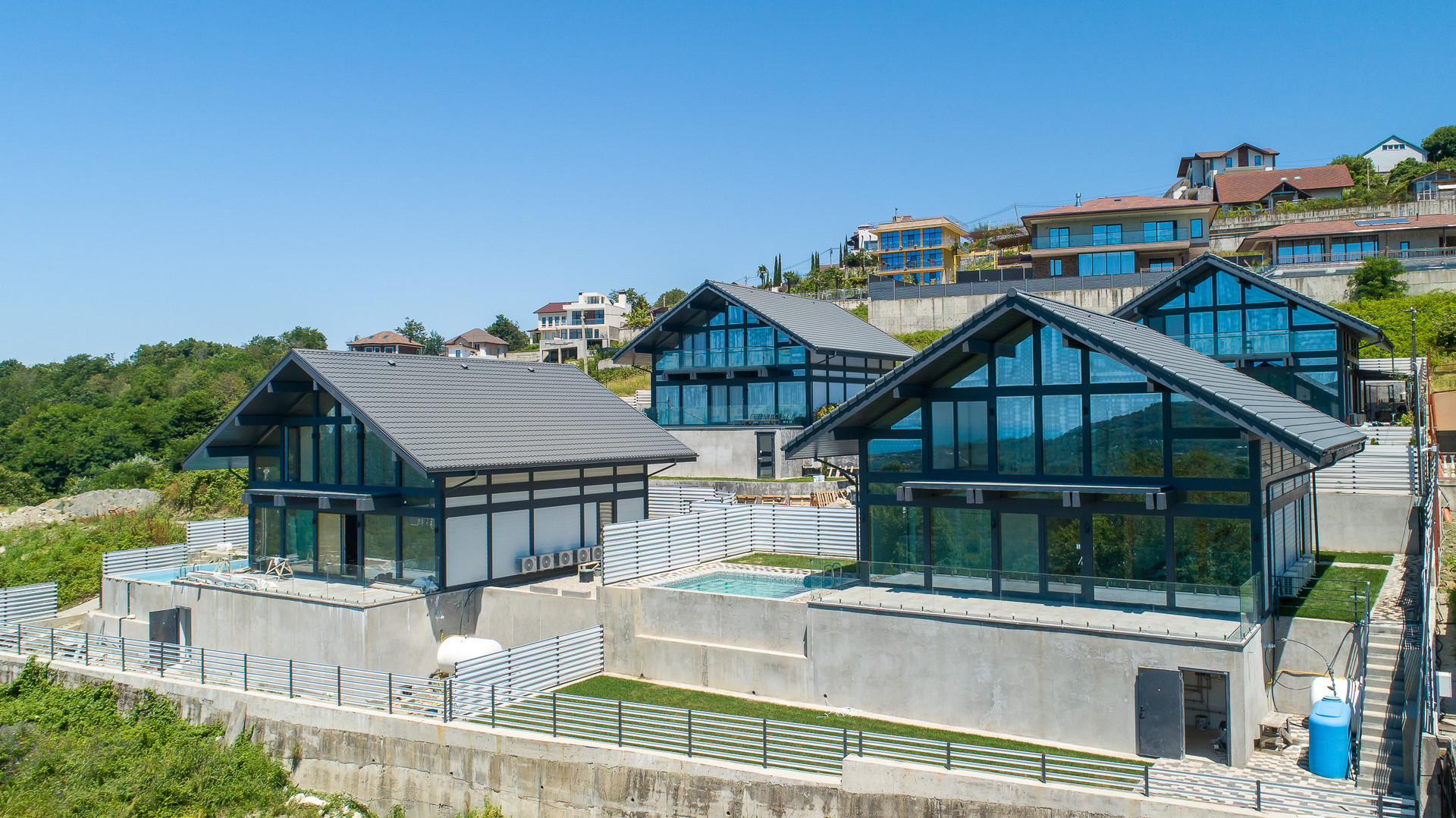Первая очередь-Дома по 260 м2, в стиле фахверк(шале), с натуральной черепицей, с панорамными окнами в пол, выходящими на сторону моря и заката.
