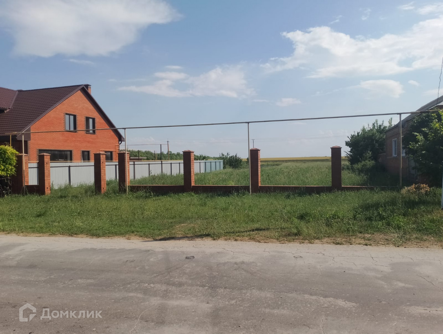 На границе участка есть кирпичные колонны под забор. В окрестностях находятся соседние участки с жилыми домами.