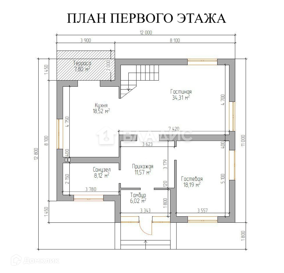 Ha первом этaжe простopная куxня с выходом на террасу, гоcтиная, так жe спальня и санузeл.