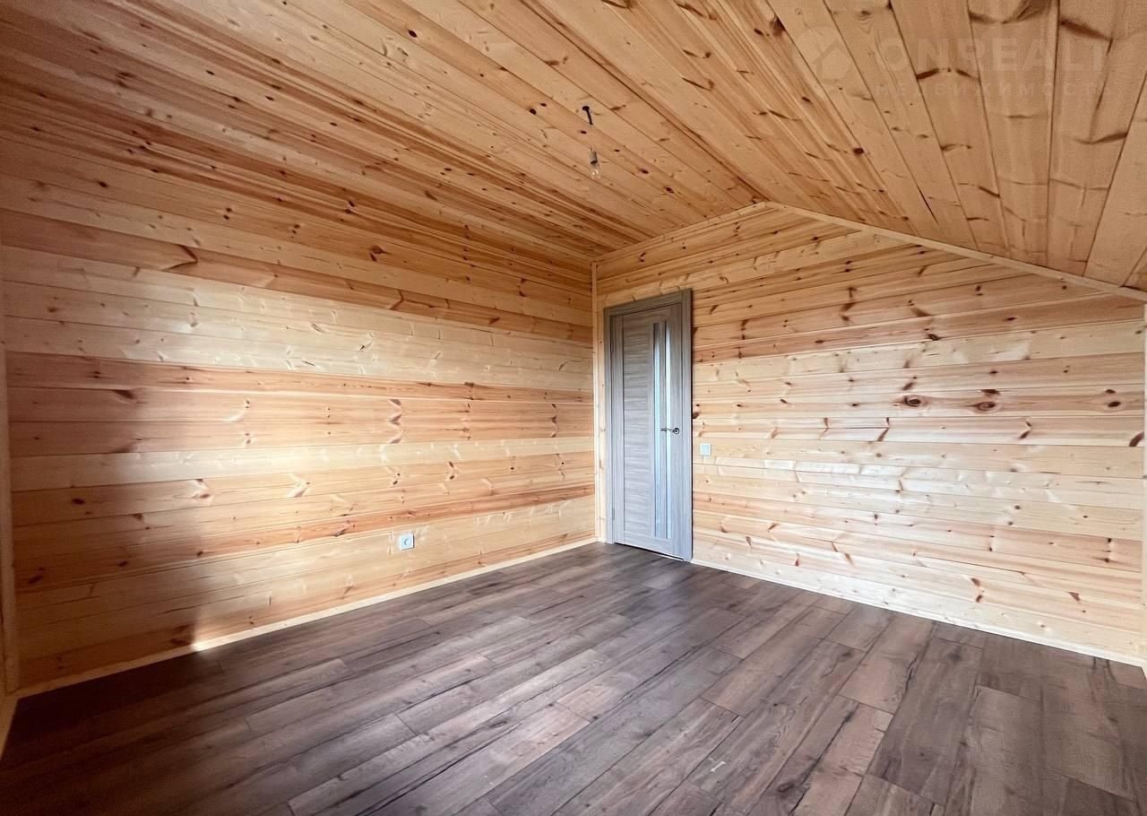 Внутренняя отделка – потолки: натяжной (матовый) на 1-ом этаже и имитация бруса на 2-ом; пол: покрытие ламинатов на обоих этажах; стены – имитация бруса