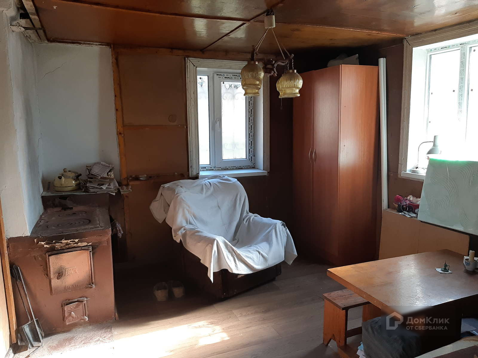 Деревянный, обложен кирпичом.