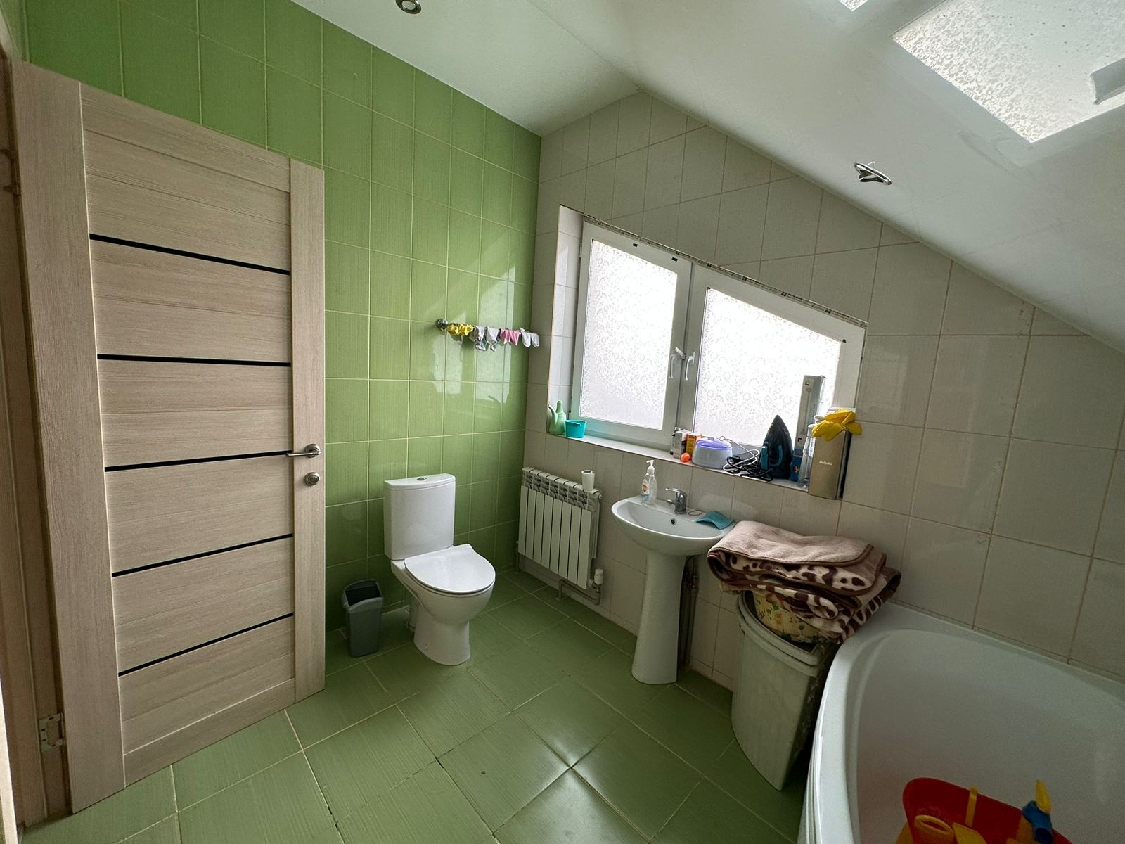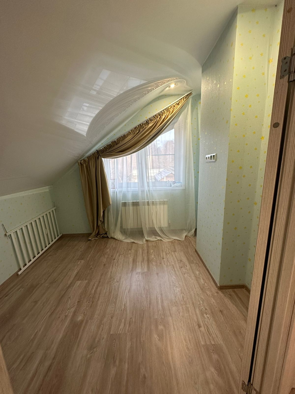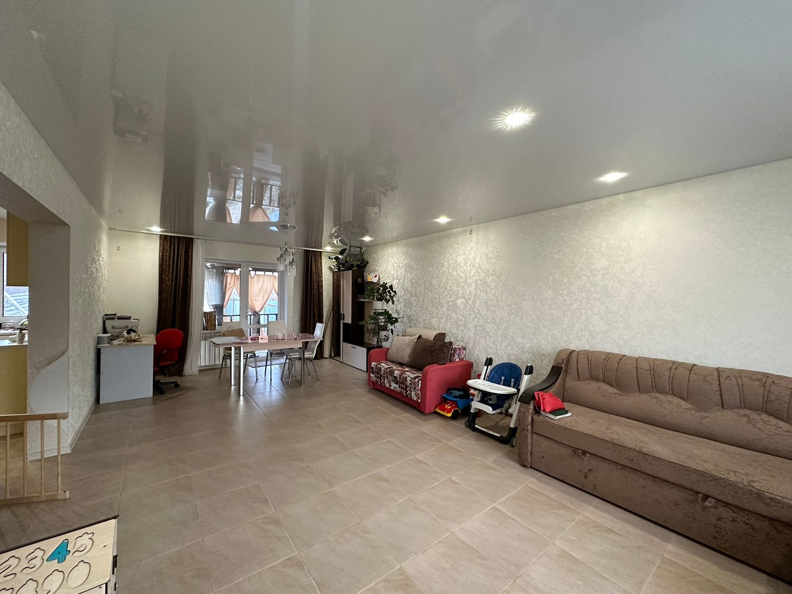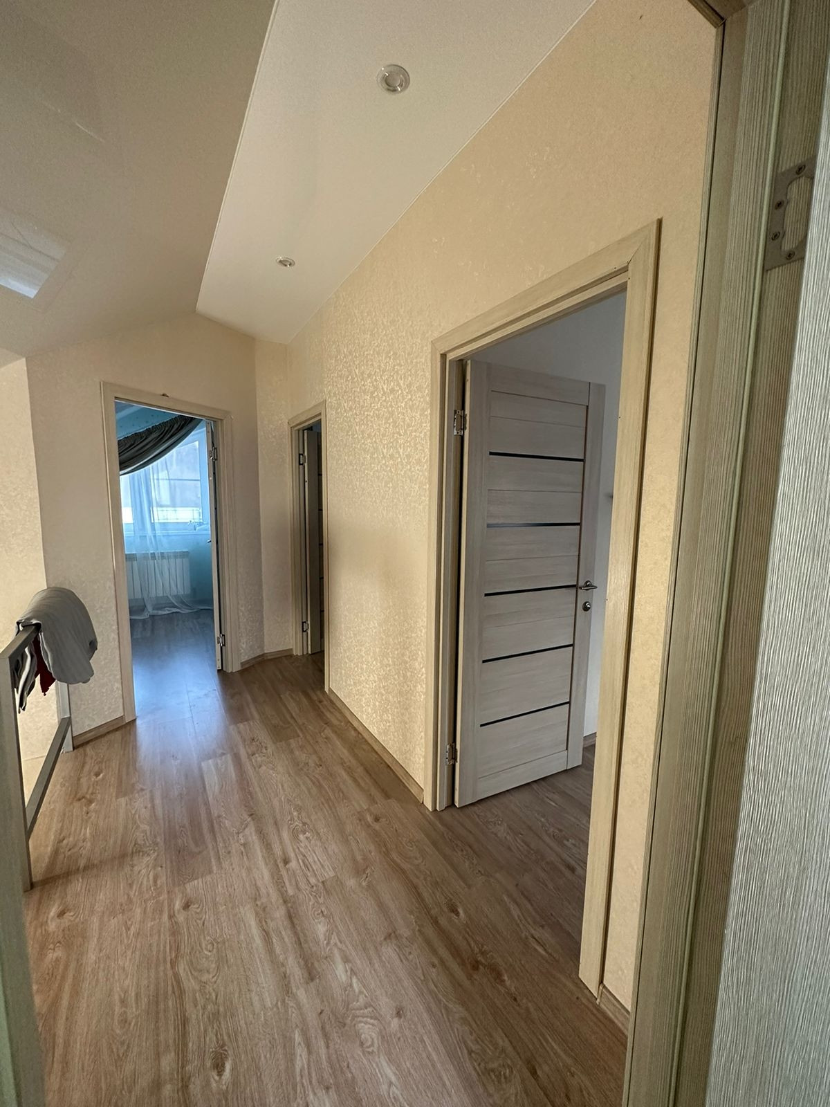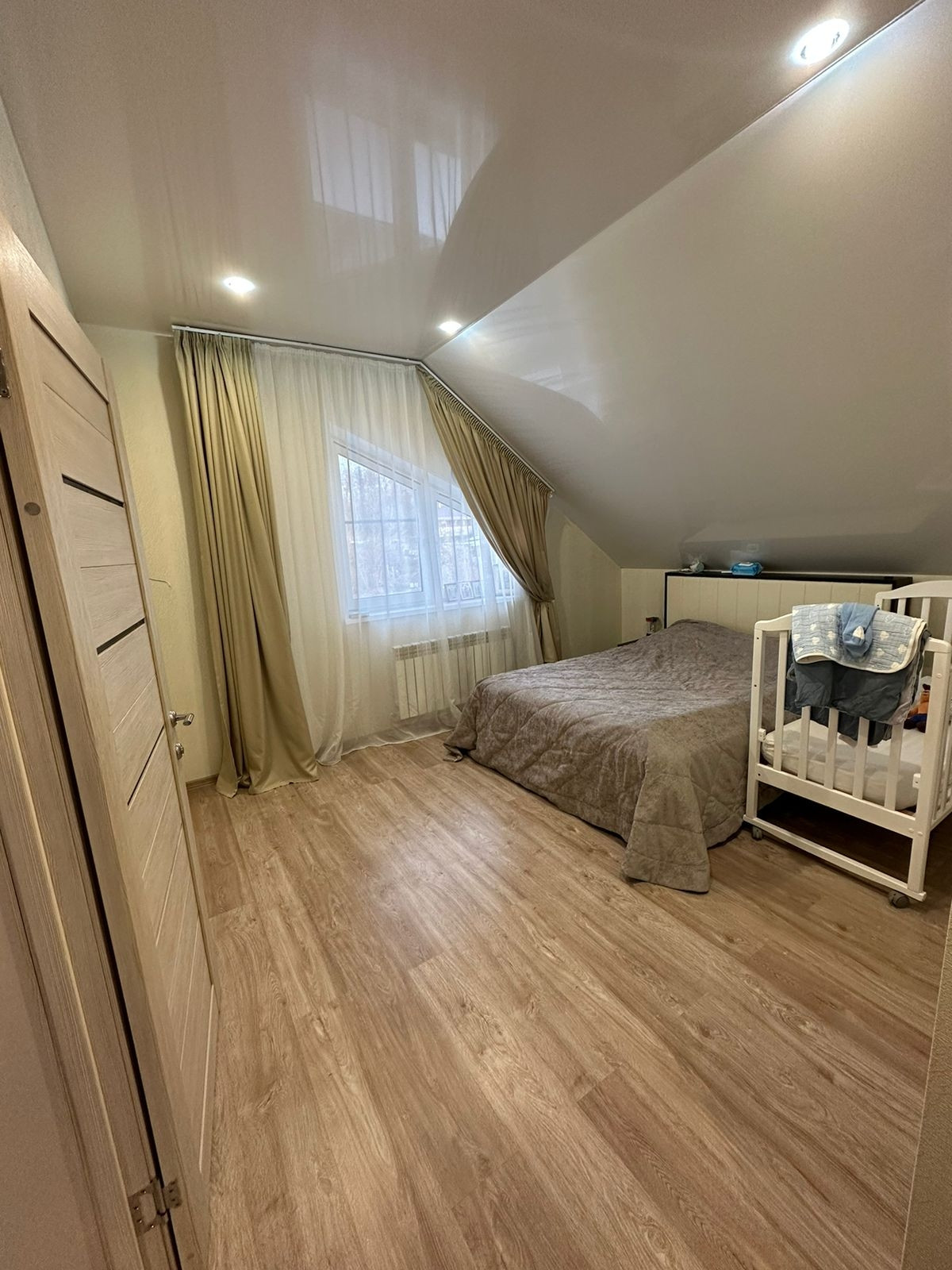 Второй этаж: натяжные потолки, пол-ламинат, 3 спальни, ванная комната.