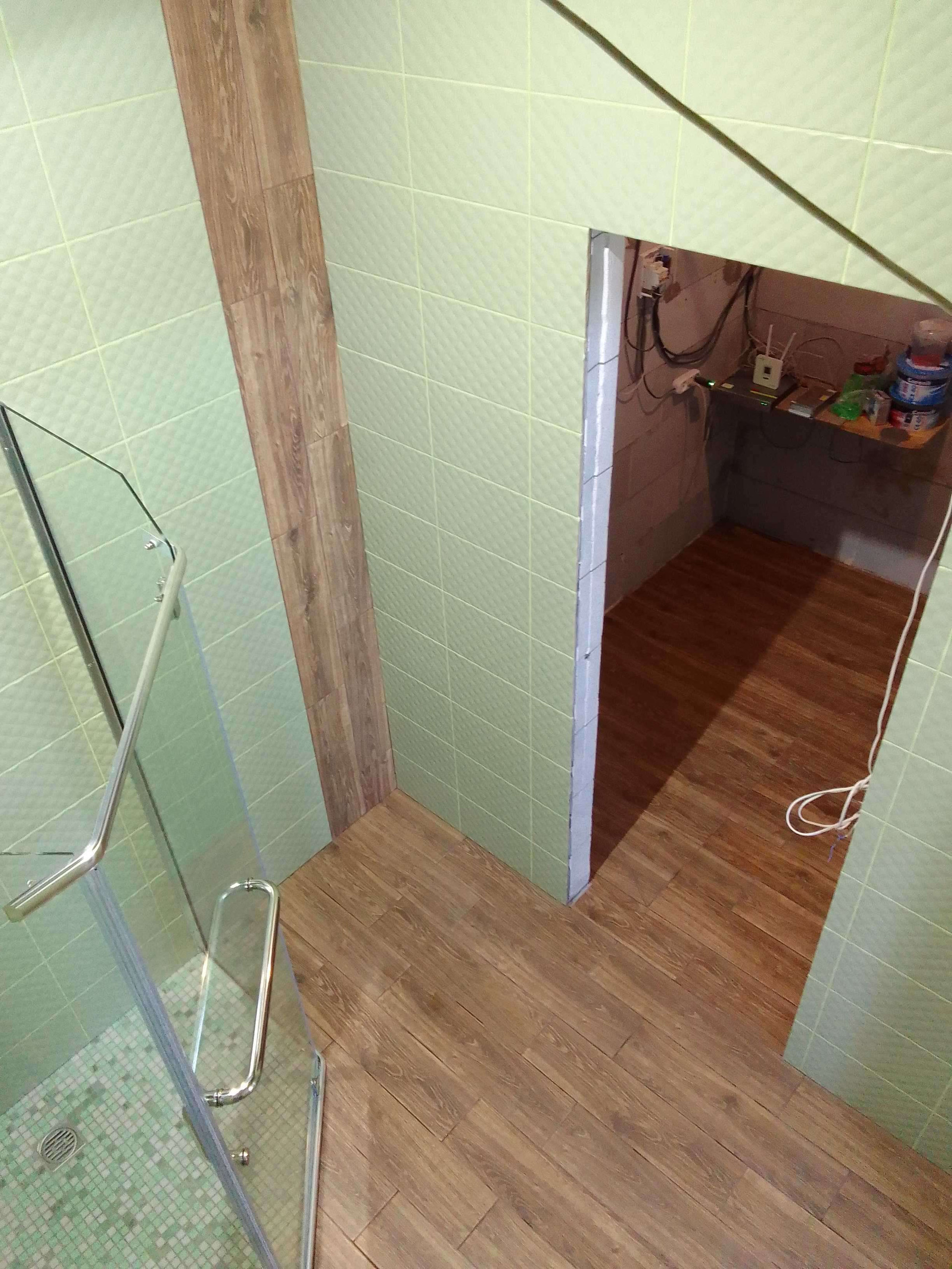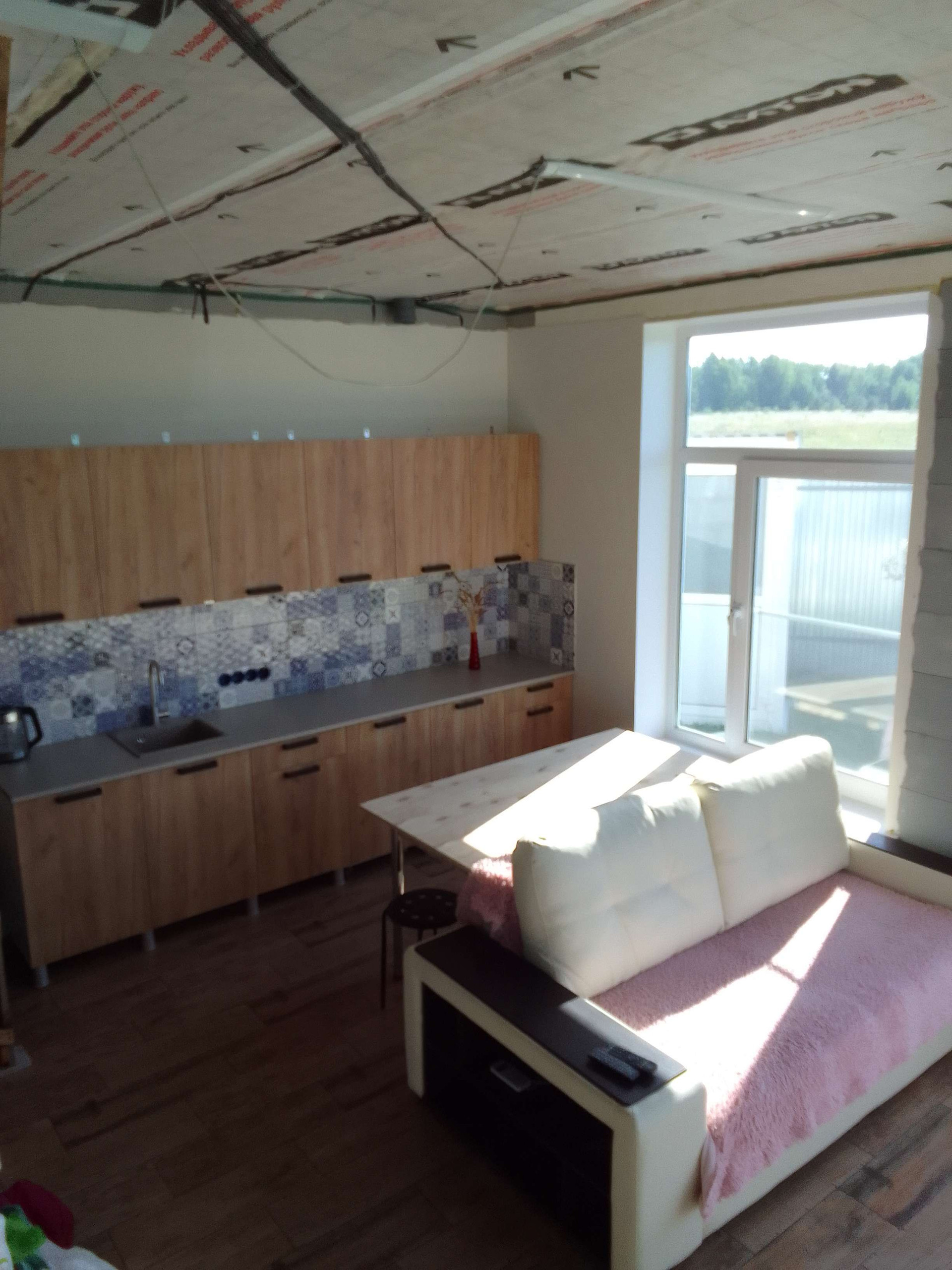 На первом этаже:Туалет,душевая,баня(не завершена),зал-кухня.Весь первый этаж керамогранит,отопление тёплый пол(водяной)от электро котла,управление через Wi Fi термостат.Санузлы кафель,душ кабинка.Встроенный кухонный гарнитур 3 метра.