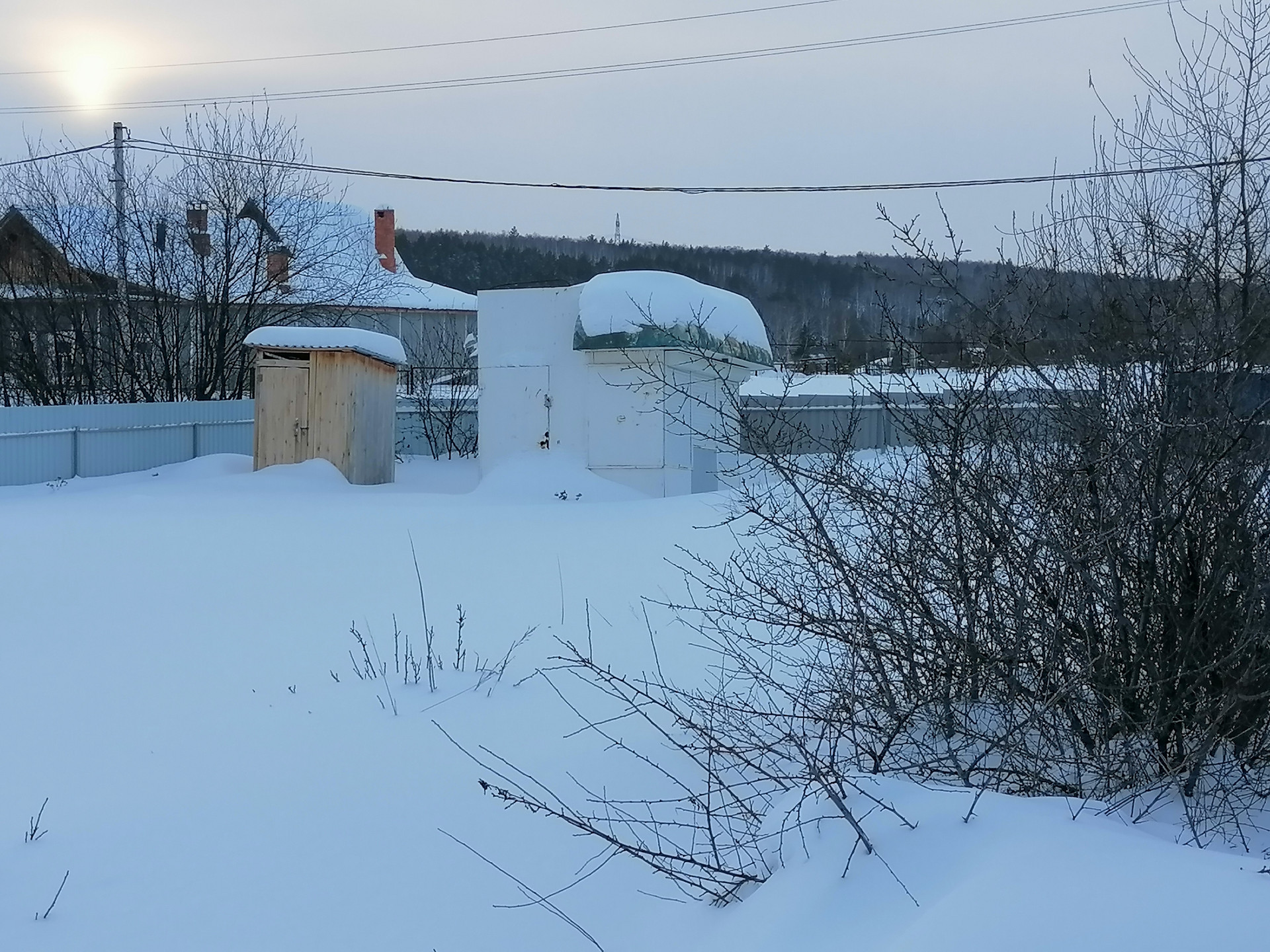 Забор с фундаментом, окна и двери сделаны, пол и крыльцо залито, печка с камином, есть летний деревянный туалет, железный киоск используемый в качестве сарайки.