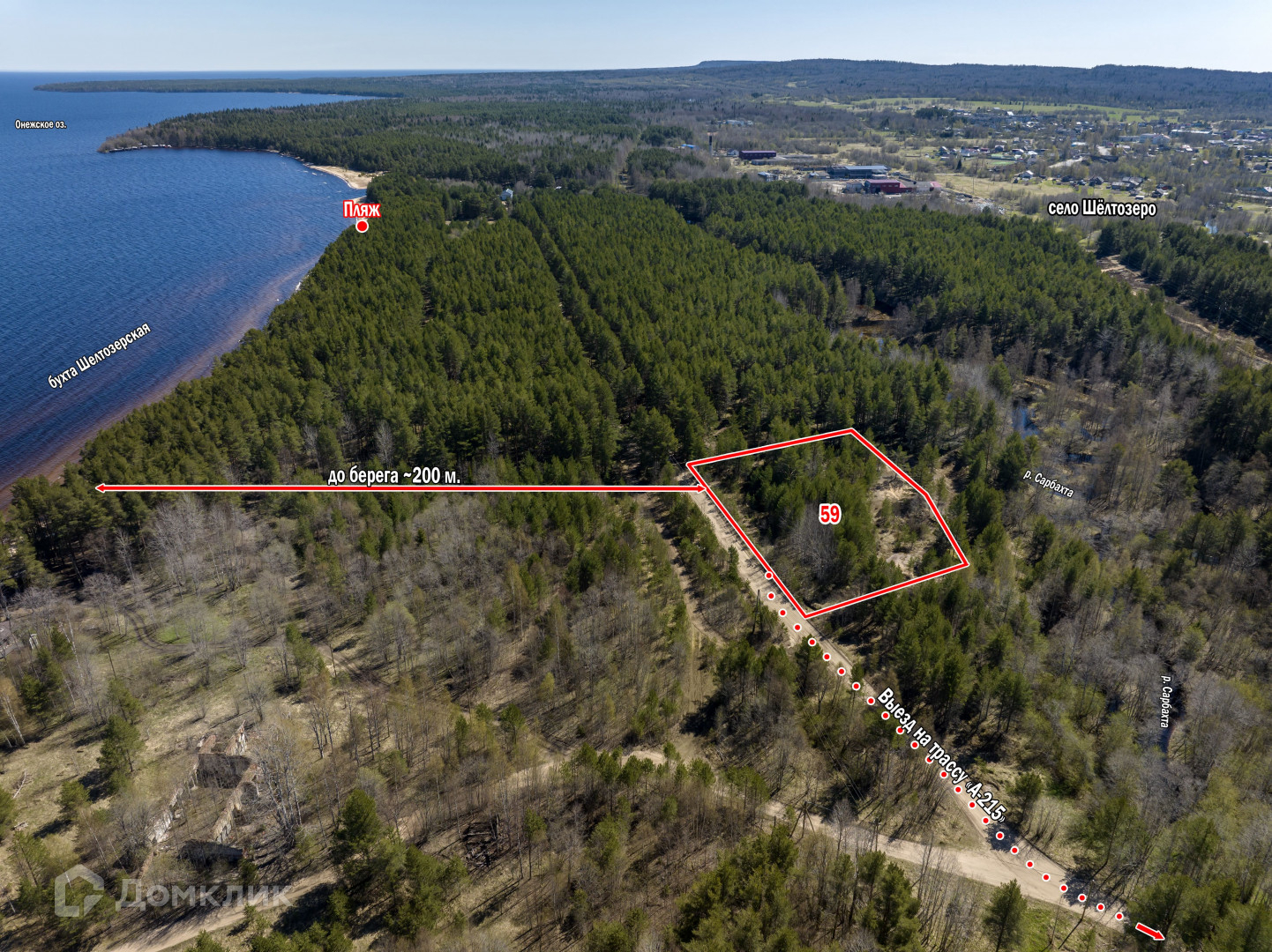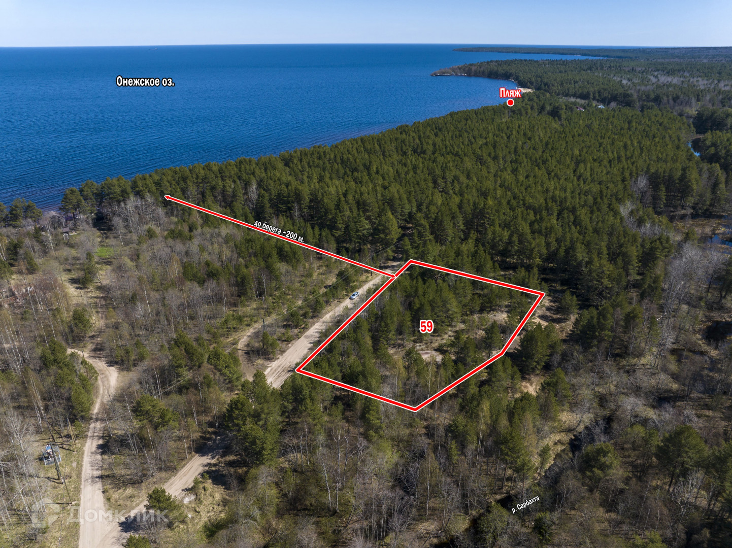 — Ближайший выход к Онежскому озеру всего - 150 метров. По другую сторону участка протекает река "Сарбахта".