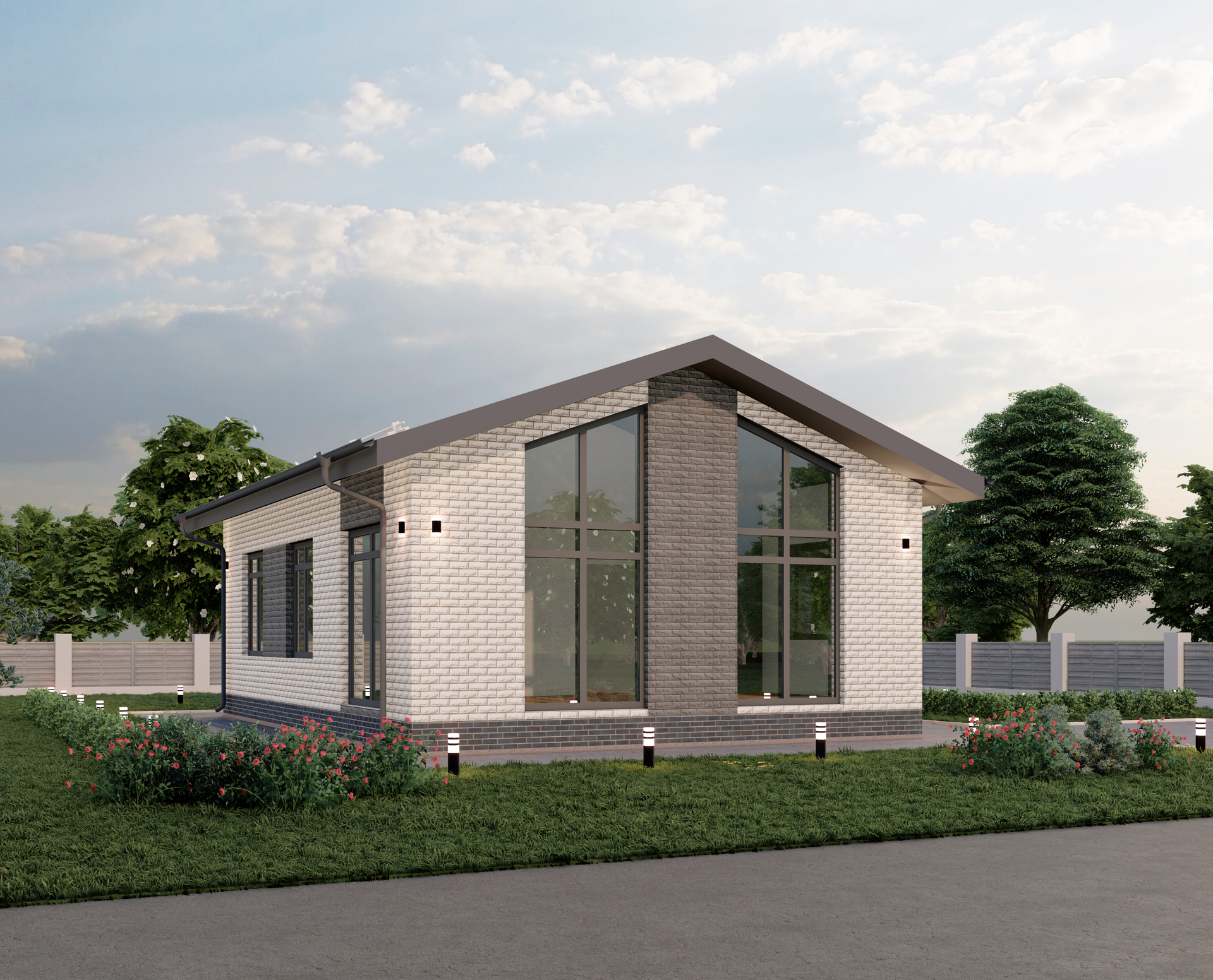 - материал стен: теплый керамический кирпич, панорамные окна;