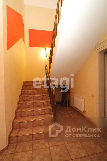 Лестница ведущая на второй этаж выложена керамогранитной плиткой, высота ступенек предусмотрена даже под шаг маленького ребенка, безопасная.