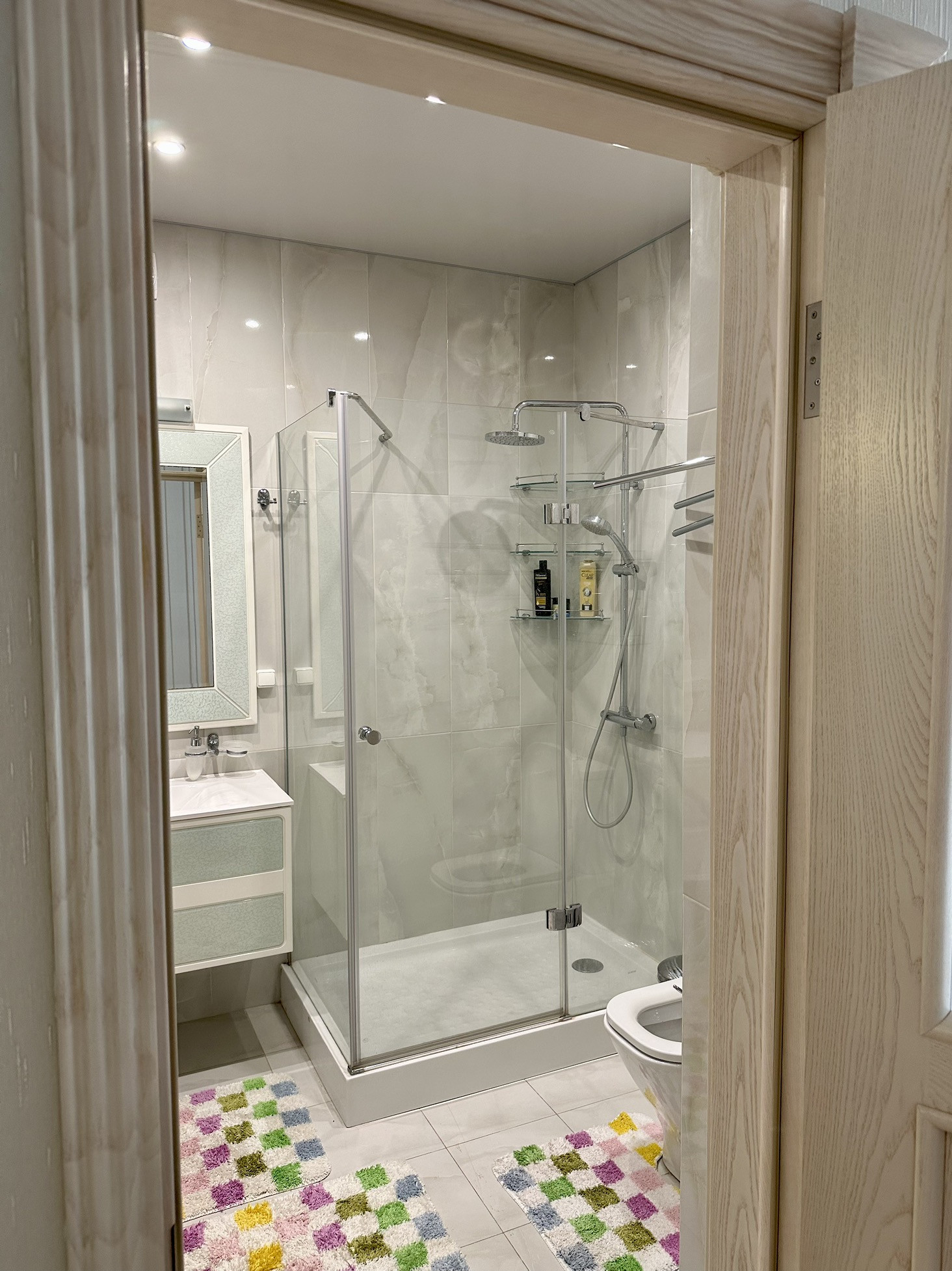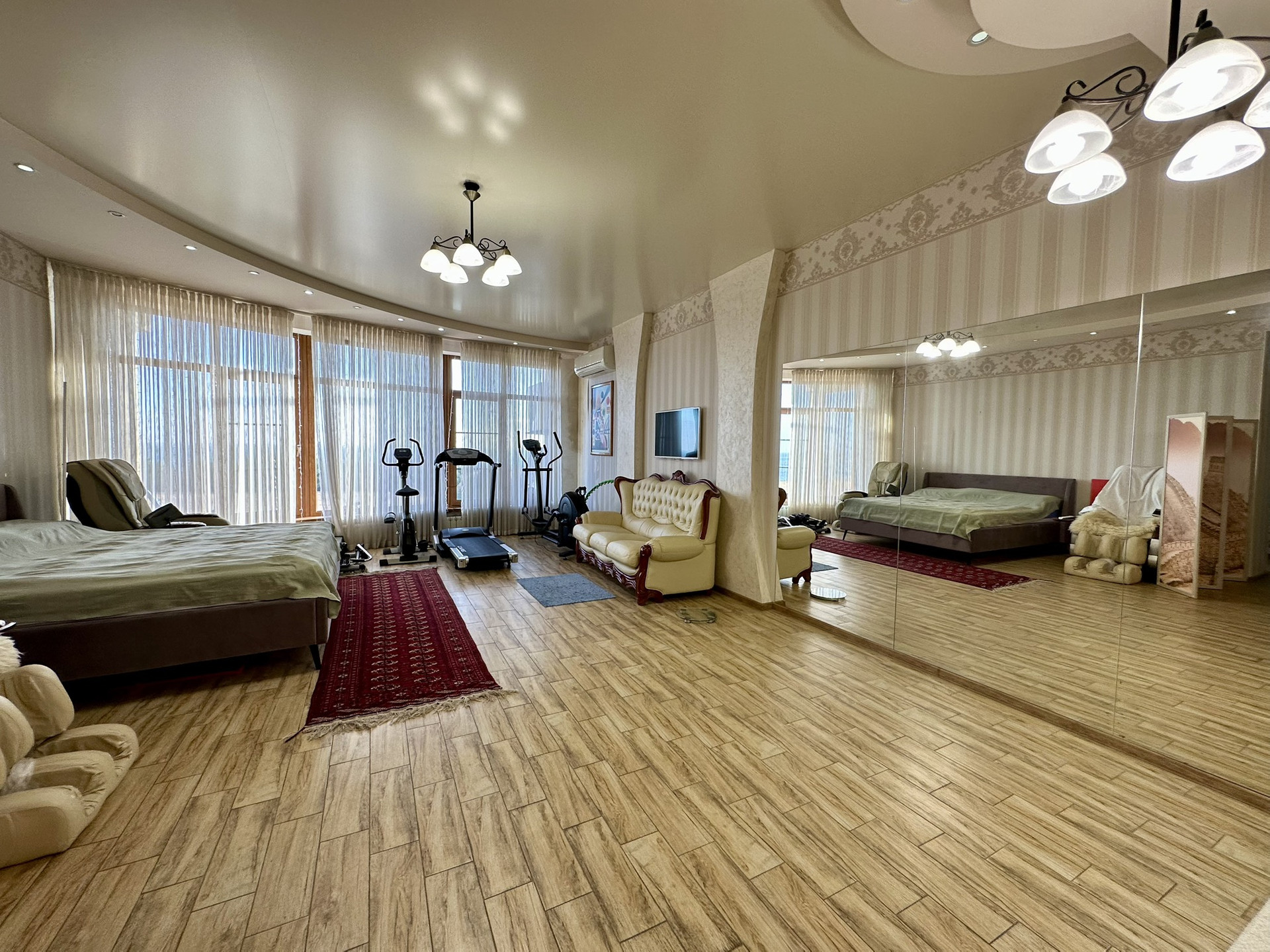 Дизайн каждой комнаты продуман до мелочей - стильные люстры, сочетания материалов, большие зеркала. Всё гармонично и аккуратно.