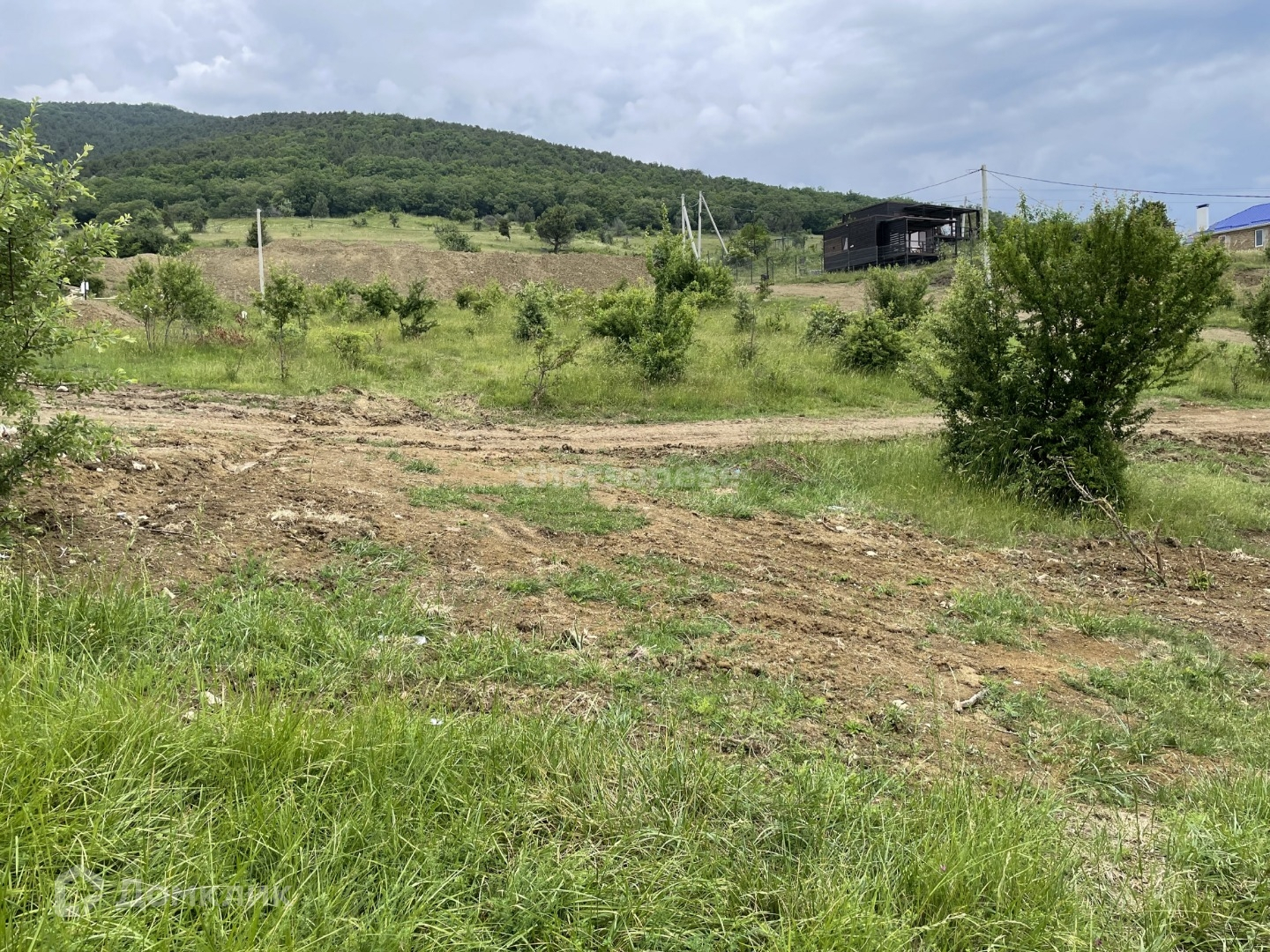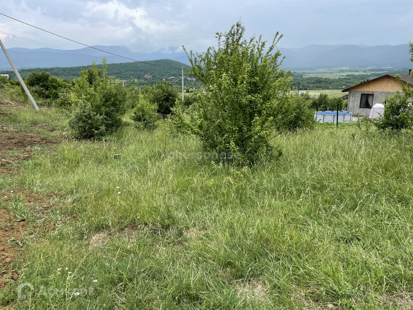 Участок почти прямоугольной формы, одна сторона скошена. Элитная застройка рядом с участком. Участок с небольшим уклоном. С участка открывается вид на горы.