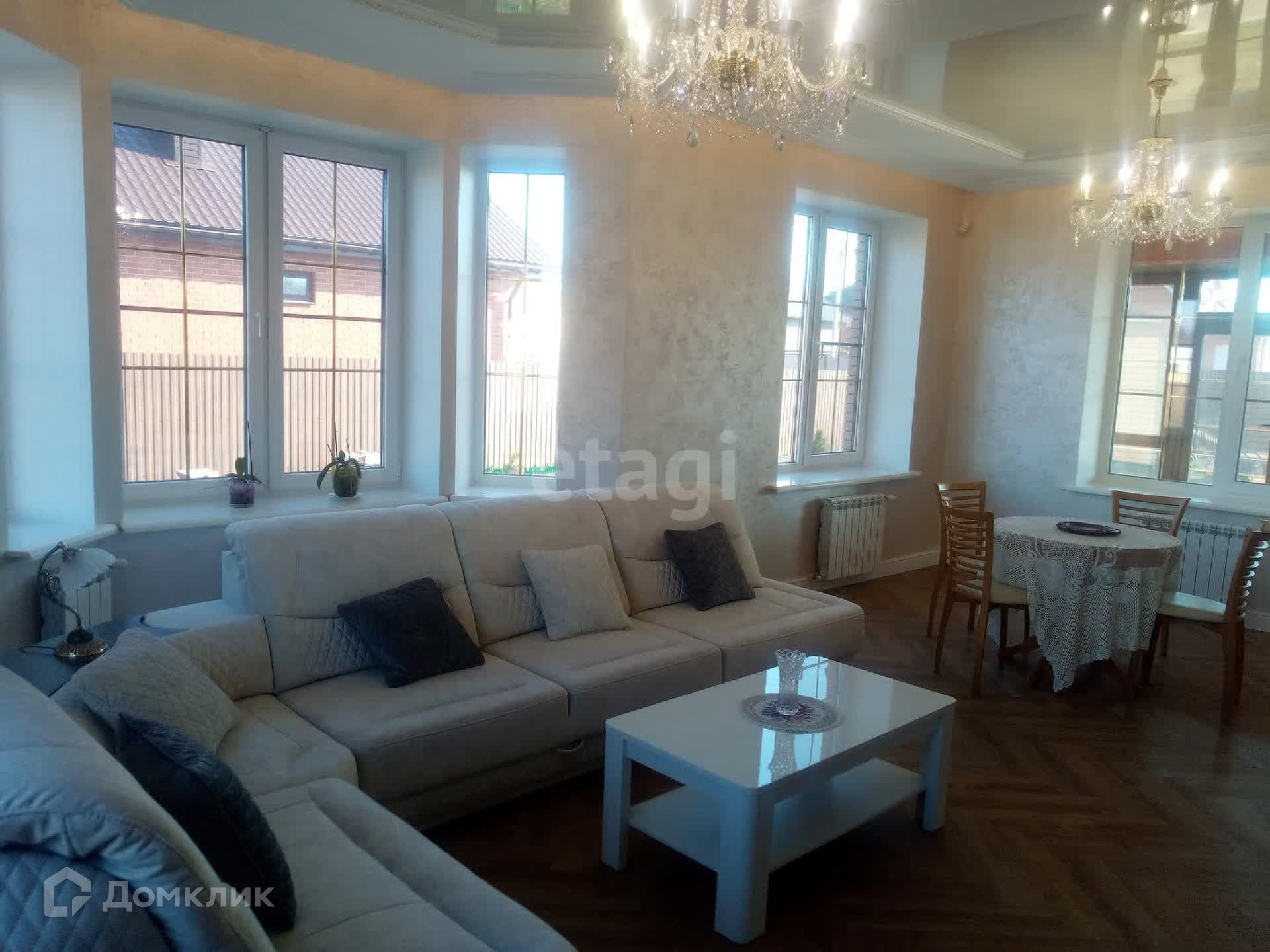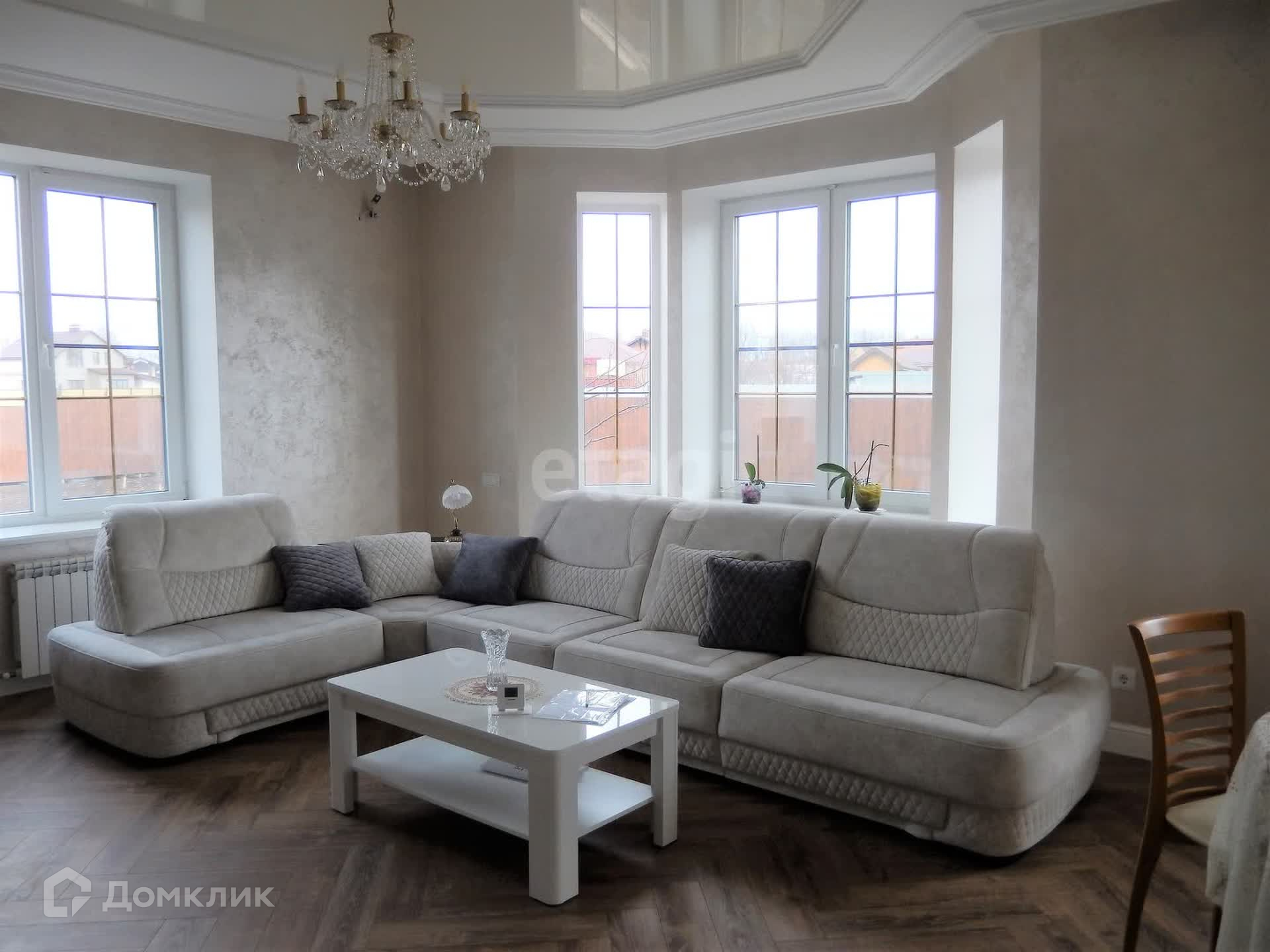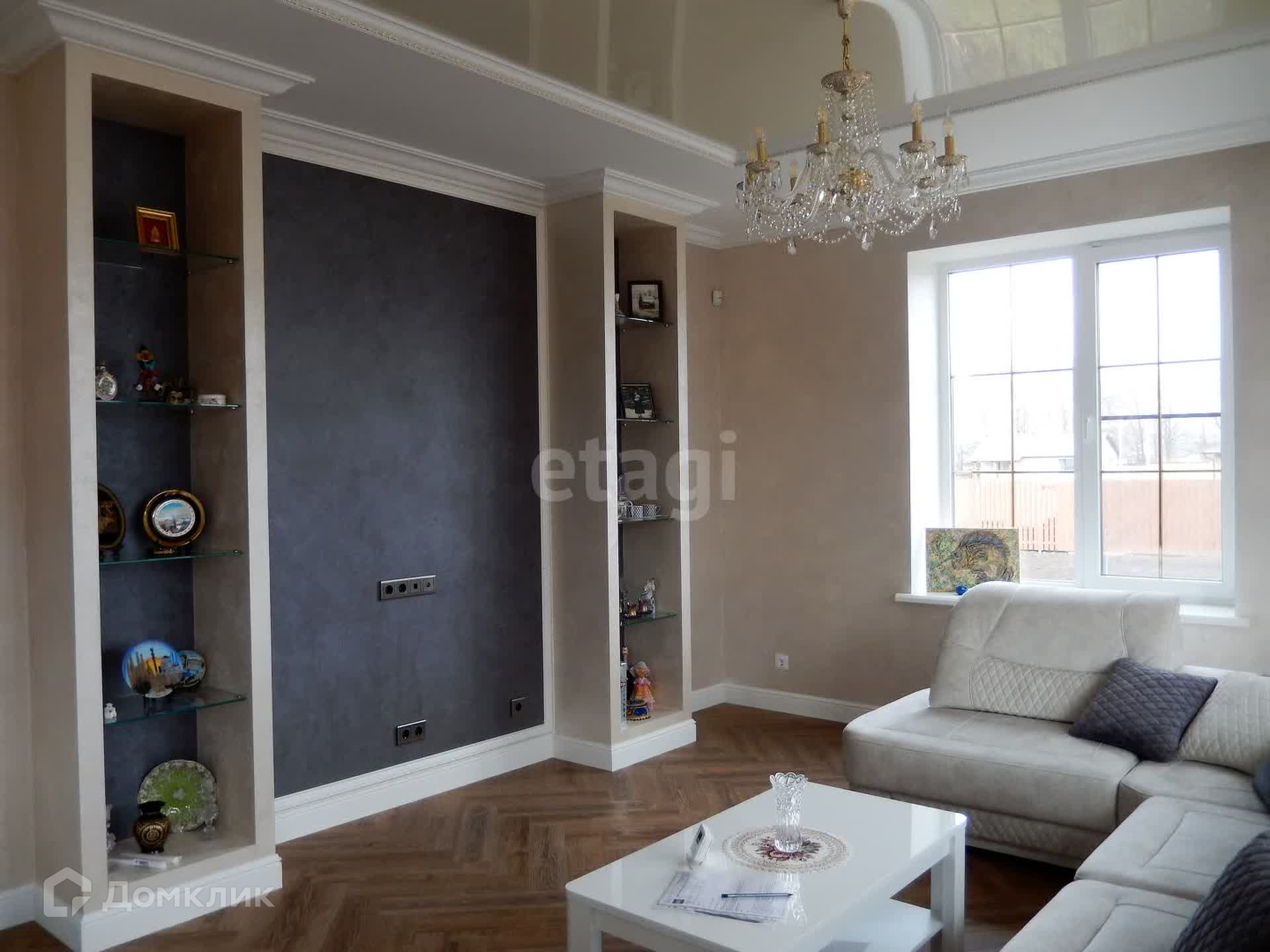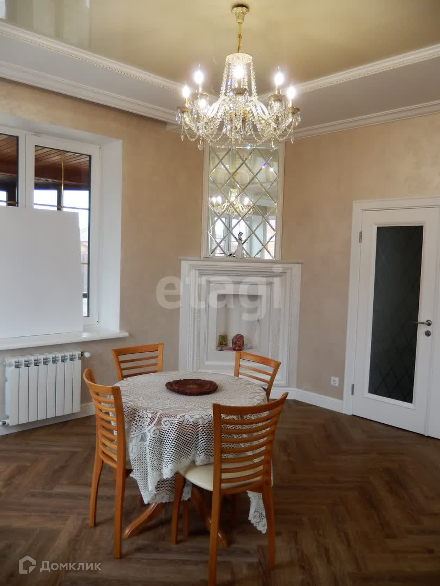 Внутренняя отделка выполнена по индивидуальному дизайн-проекту из качественных дорогих строительных материалов. Обе ванные комнаты выложены плиткой производства Испания, отделка внутренних стен выполнена из фактурной штукатурки (производства Италии и России) первый этаж и лестничный марш, второй этаж - обои производства Италия, первый этаж полы плитка и ламинат (производства Франция), по всему периметру 1-го этажа теплый пол. Плиткой пр-ва Италия выложена рабочая стена кухни, многоуровневый потолок (штукатурка, гипсокартон, натяжные тканевые потолки).