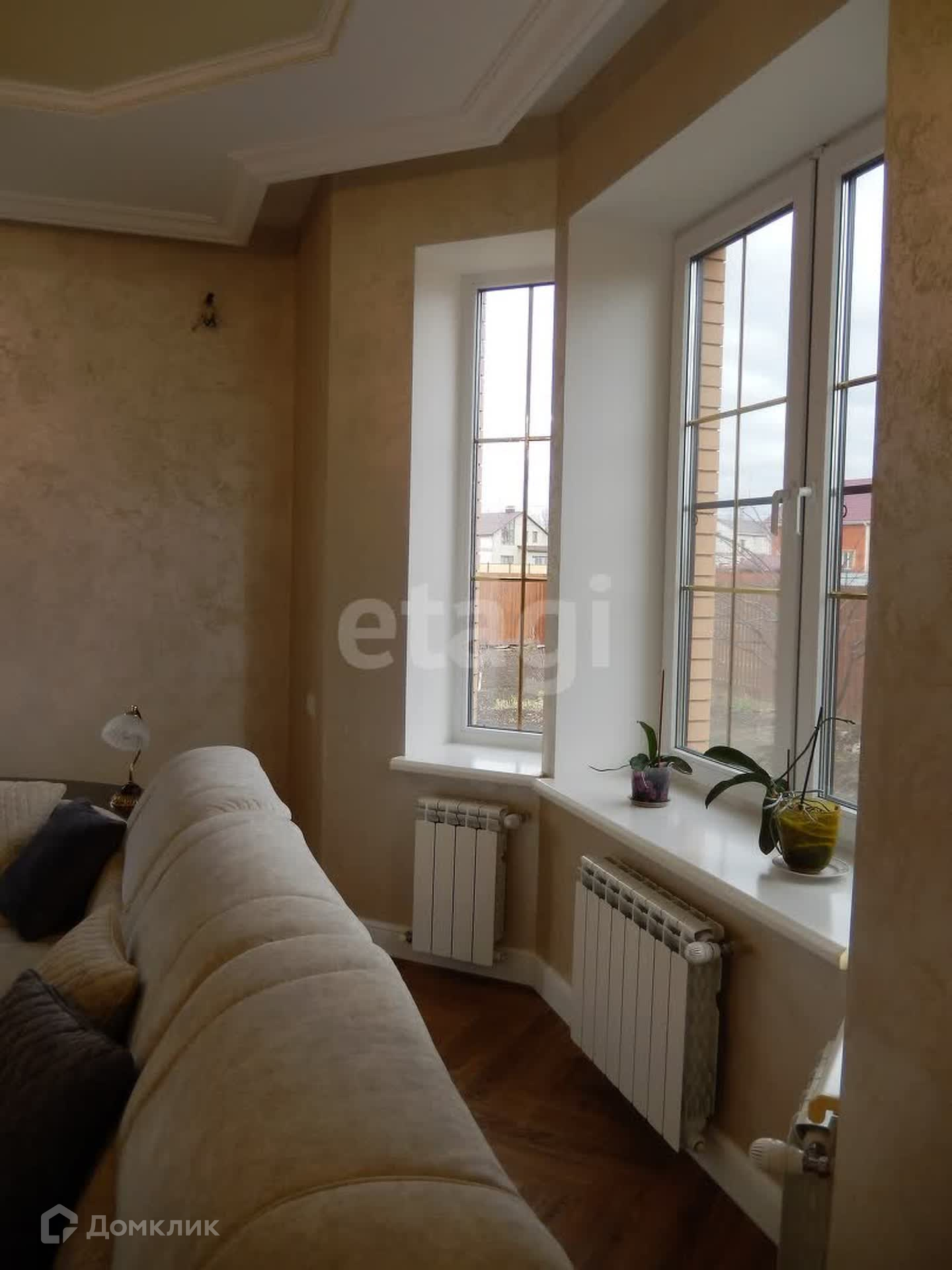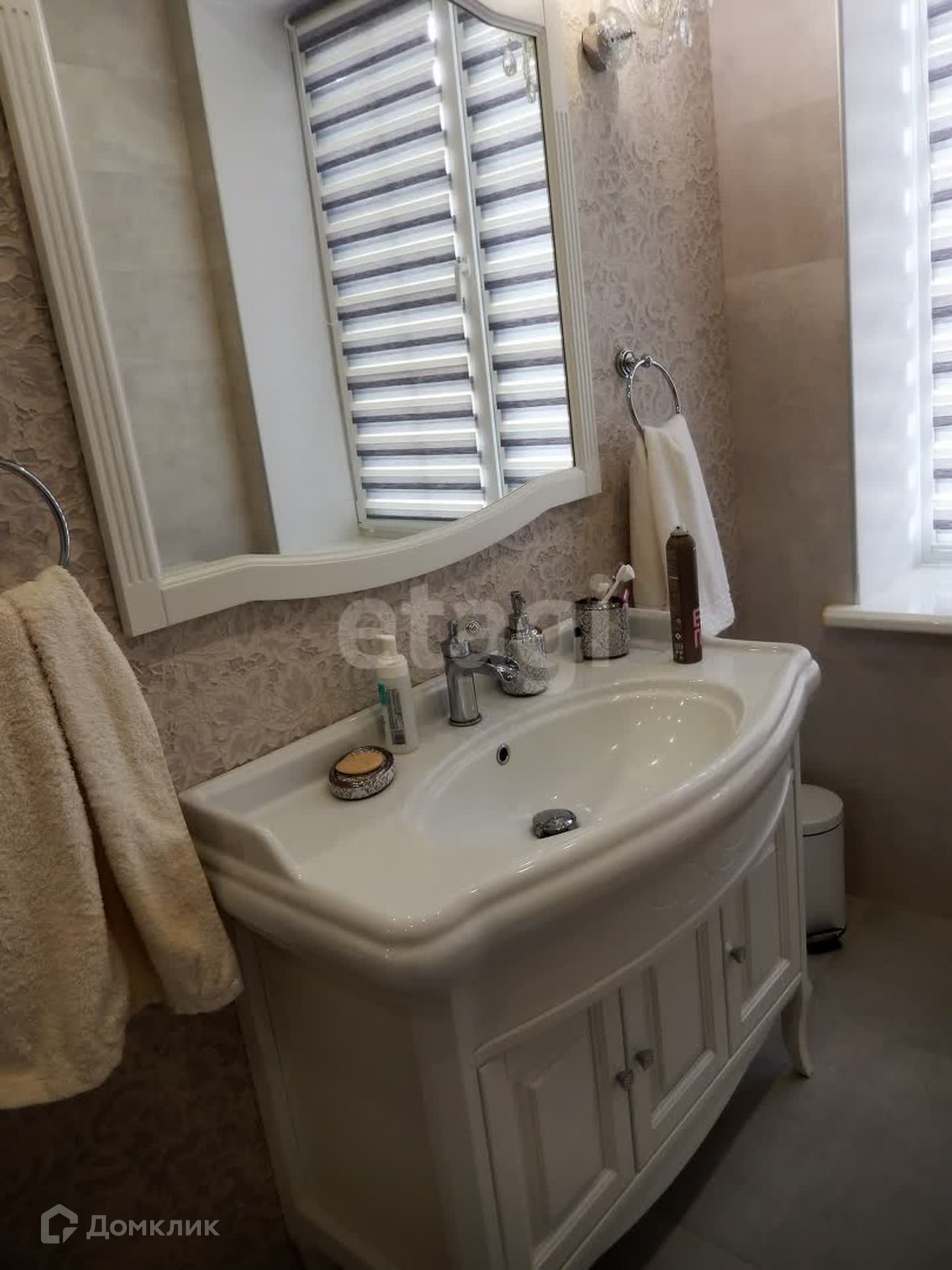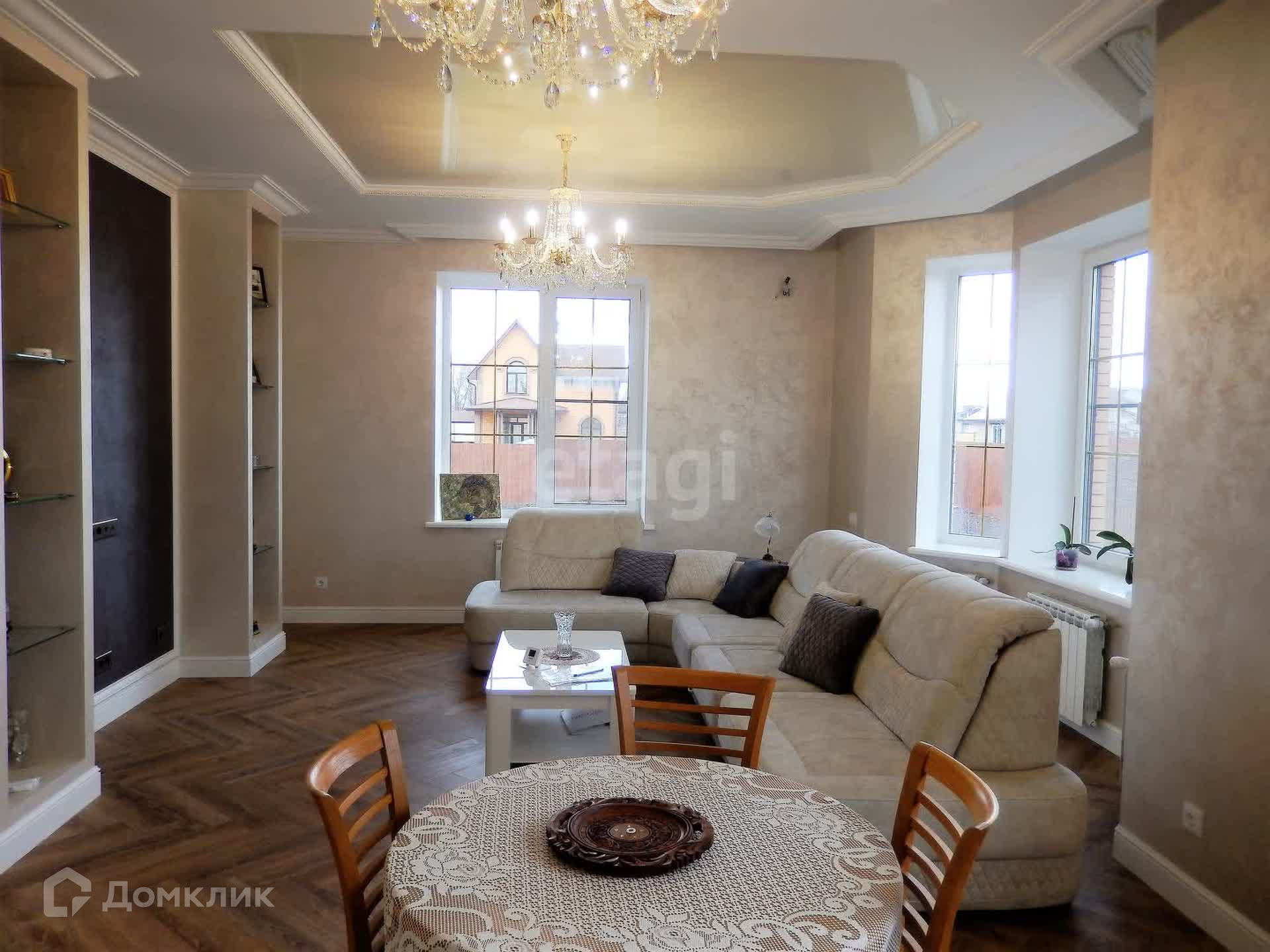 Внутренняя отделка выполнена по индивидуальному дизайн-проекту из качественных дорогих строительных материалов. Обе ванные комнаты выложены плиткой производства Испания, отделка внутренних стен выполнена из фактурной штукатурки (производства Италии и России) первый этаж и лестничный марш, второй этаж - обои производства Италия, первый этаж полы плитка и ламинат (производства Франция), по всему периметру 1-го этажа теплый пол. Плиткой пр-ва Италия выложена рабочая стена кухни, многоуровневый потолок (штукатурка, гипсокартон, натяжные тканевые потолки).