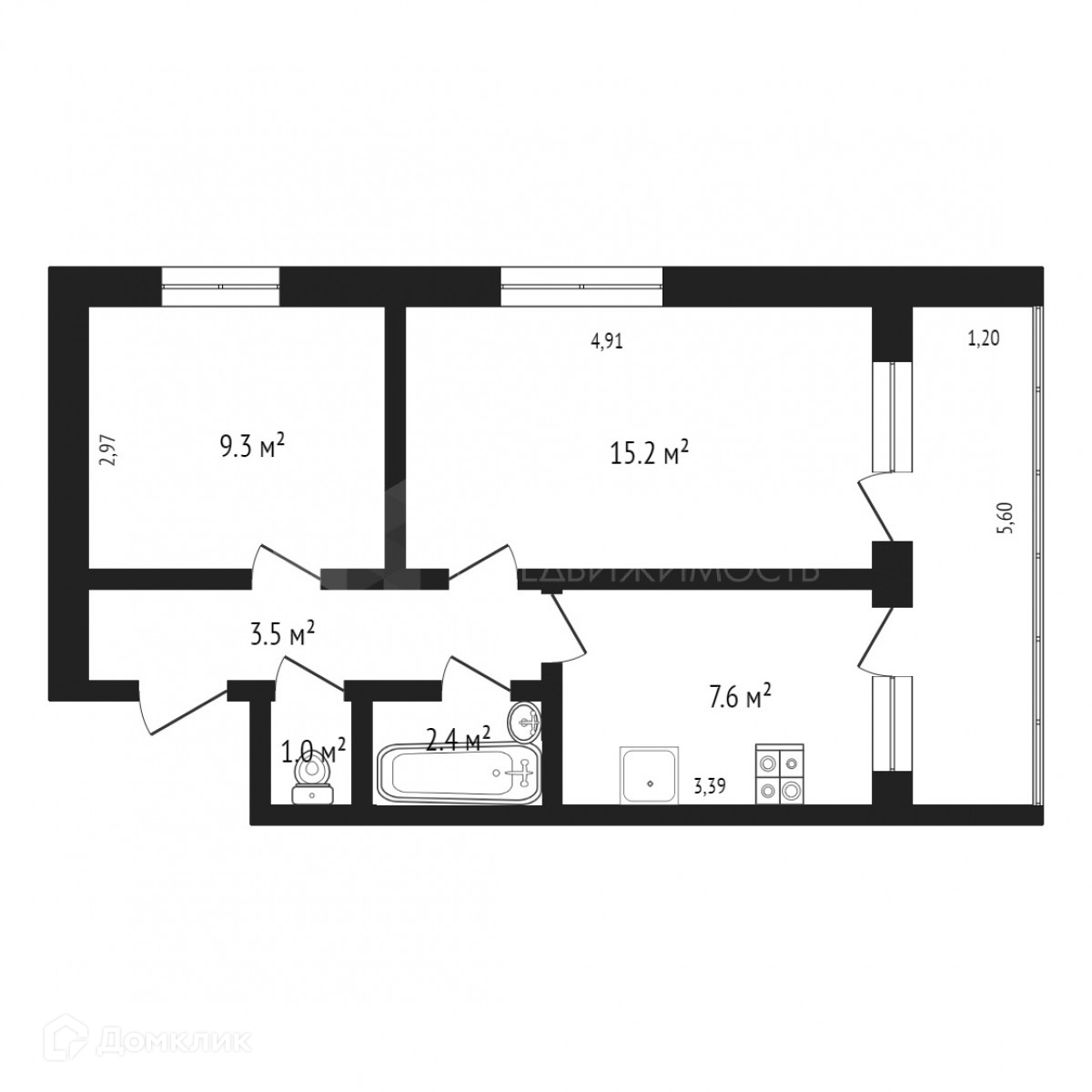 Общая площадь 39.5 м2