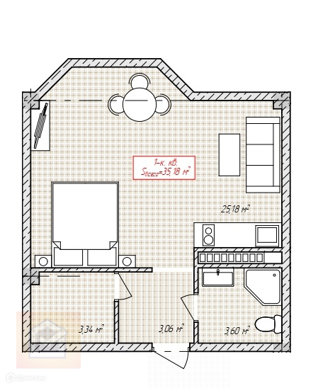 Комната-студия 25 кв.м, с/у 3.60 кв.м, прихожая 3.06 кв.м, гардеробная 3.34 кв.м