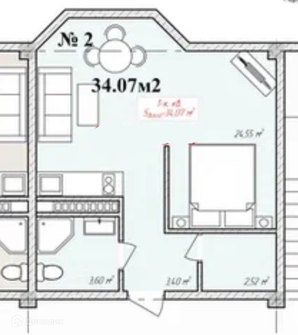 Общая площадь 34.07 м2