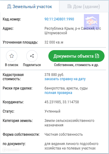 Вид разрешенного использования земельного участка - для личного подсобного хозяйства на полевых участках. По Генплану Штормовского сельского поселения, утверждённому в 2018 году, участок вошёл в границы села Хуторок.