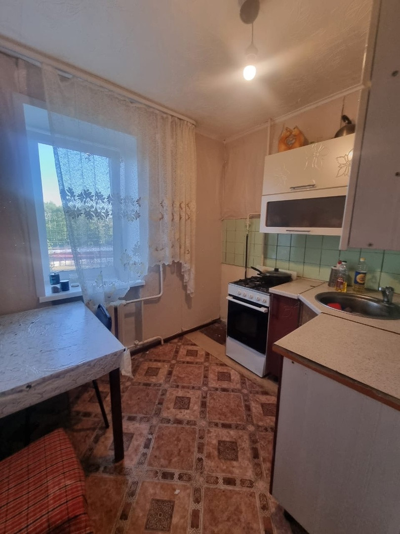 Небольшая кухня оборудована кухонным гарнитуром, который останется в подарок новым хозяевам. В кухне установлен стеклопакет.
