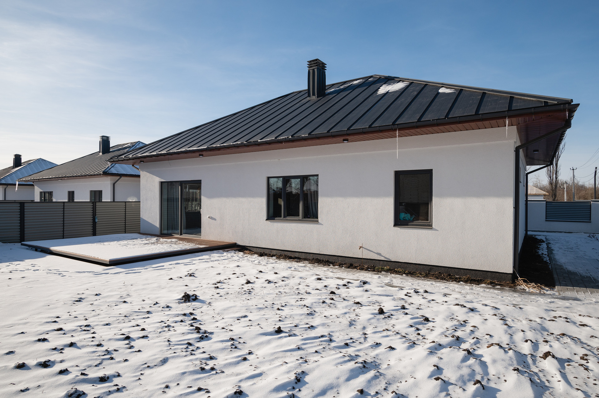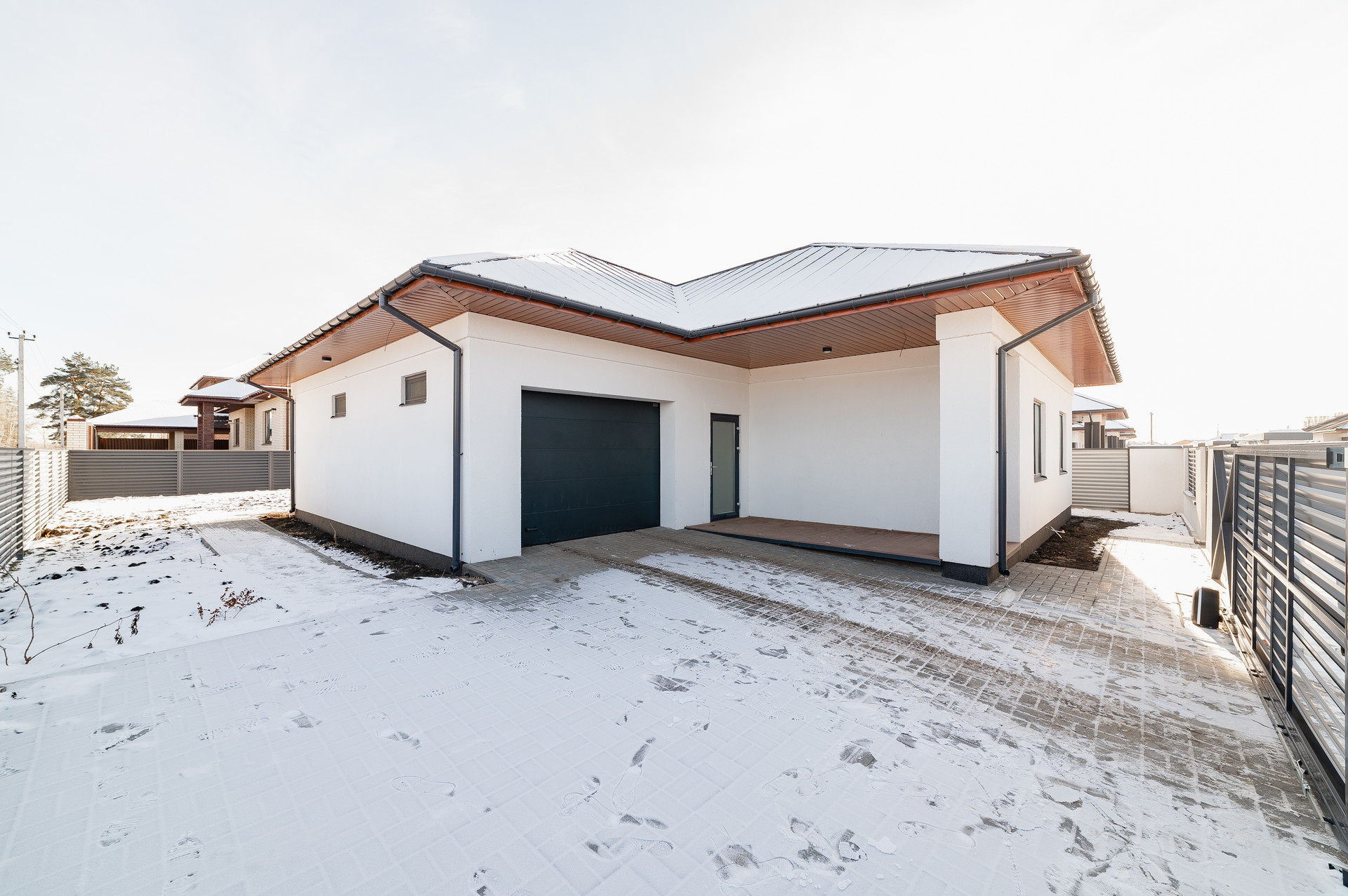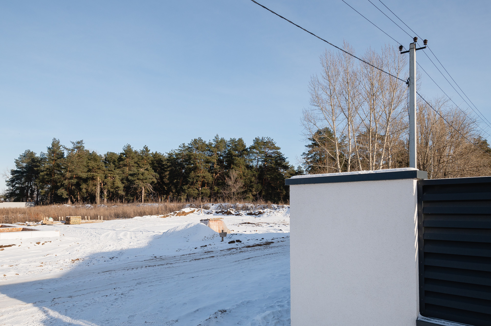 Участок правильной формы, забор, бетонированная отмостка вокруг дома и плита под 2 машины.