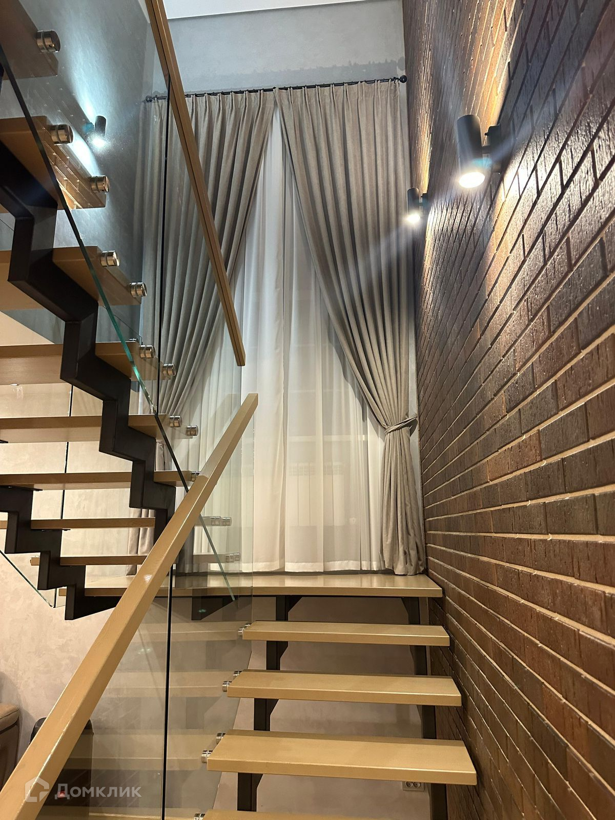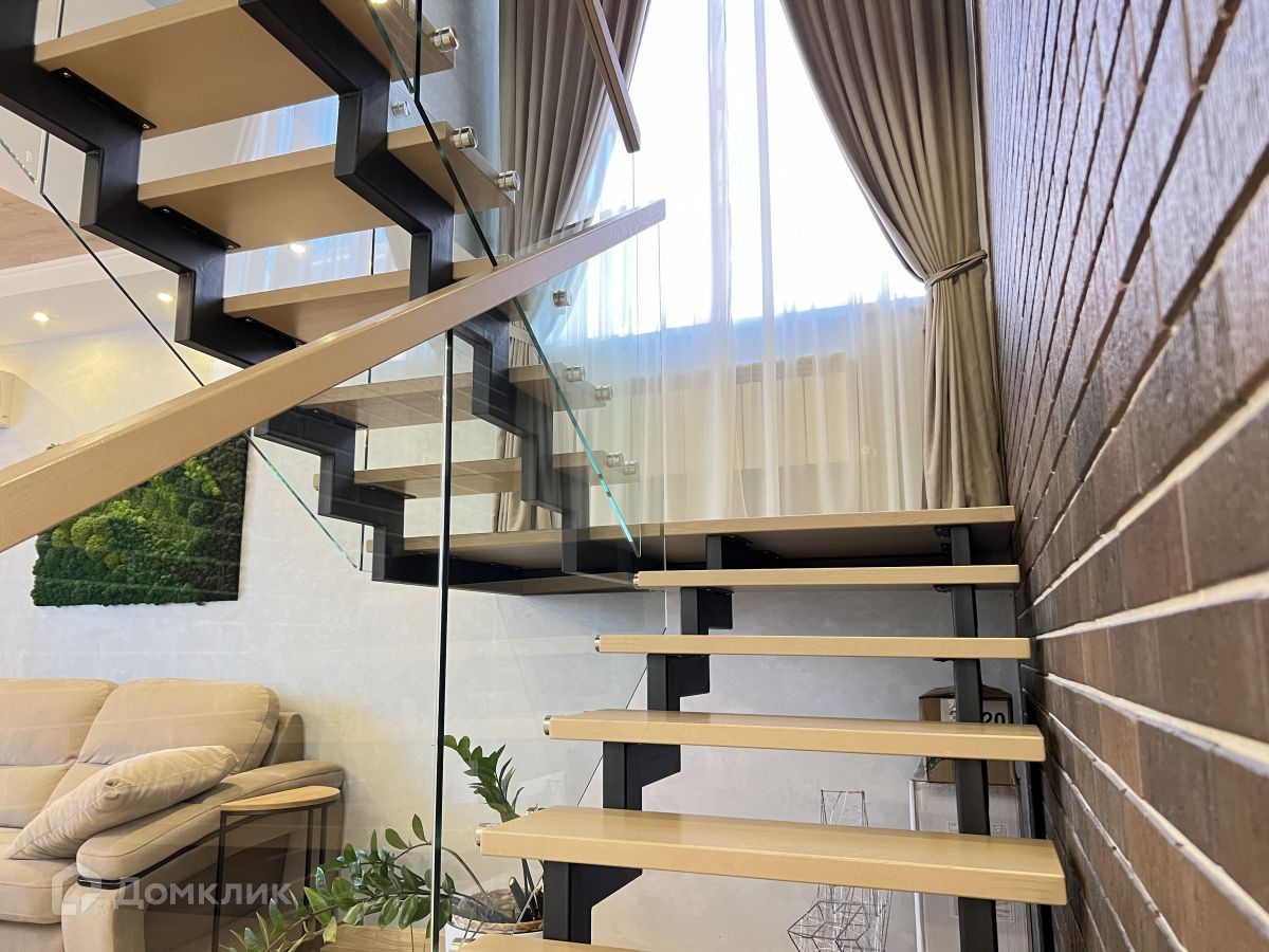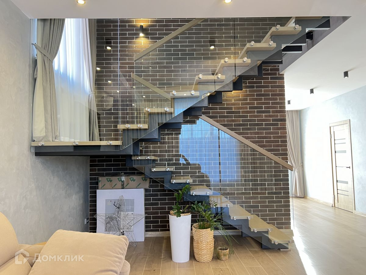 Эффектная лестница со стеклянными перилами расширяет пространство.