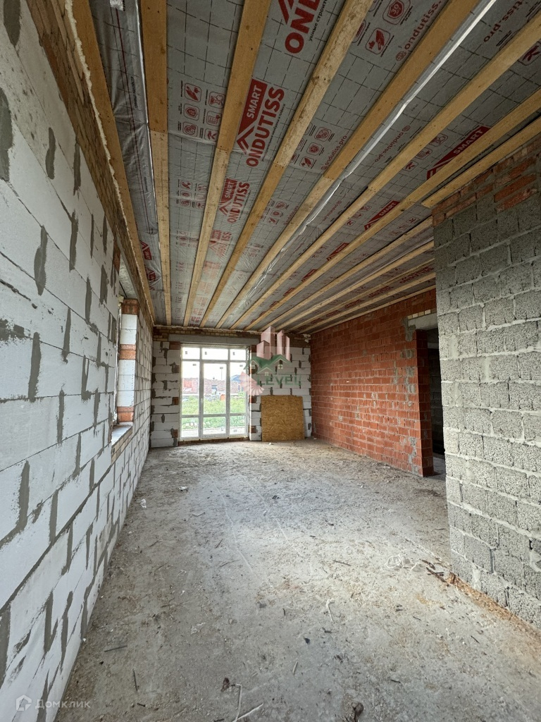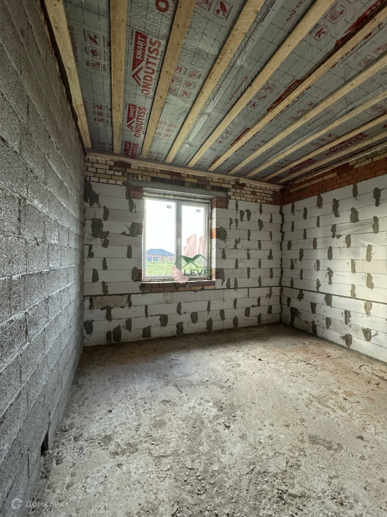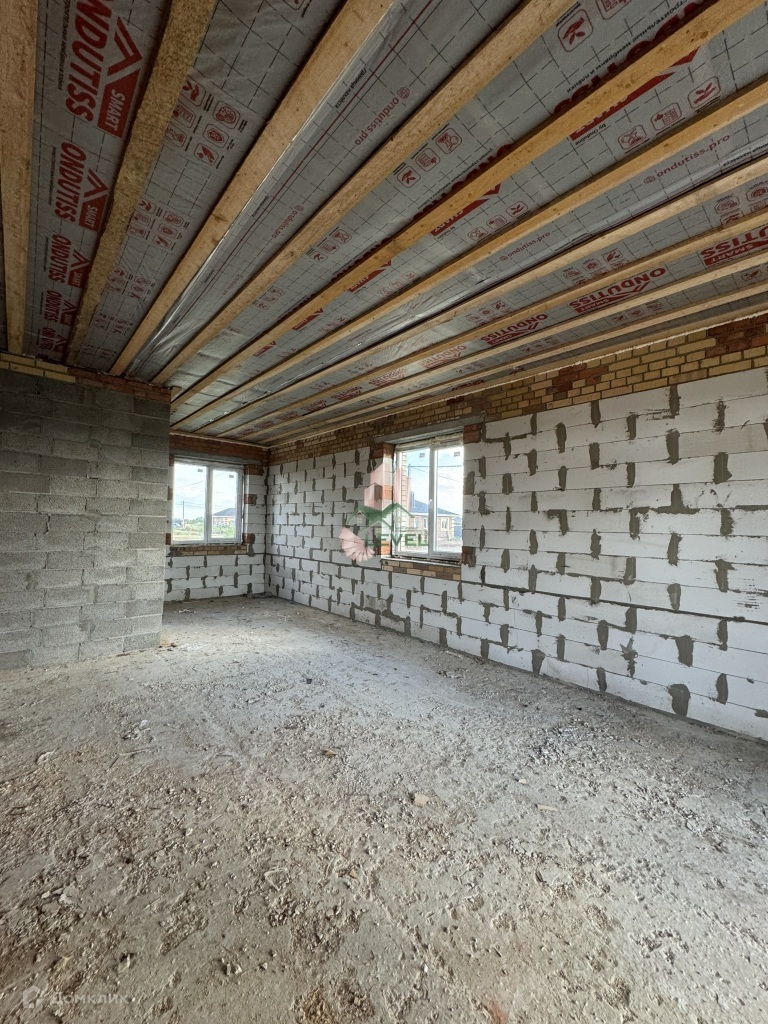 Крыша накрыта мягкой кровлей. В доме высокие потолки, просторные, светлые комнаты, на полу черновая стяжка.