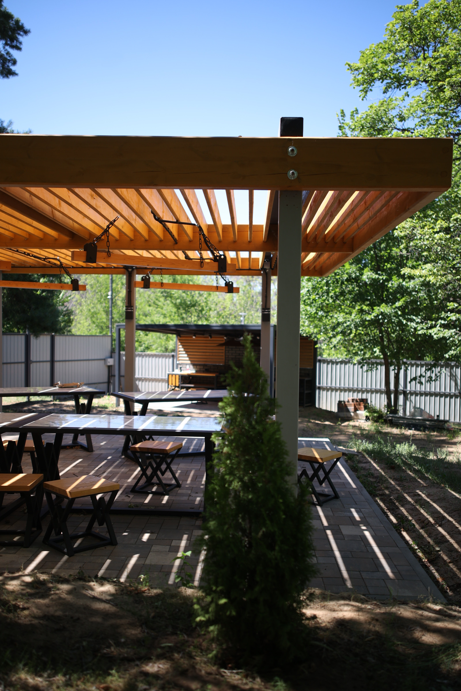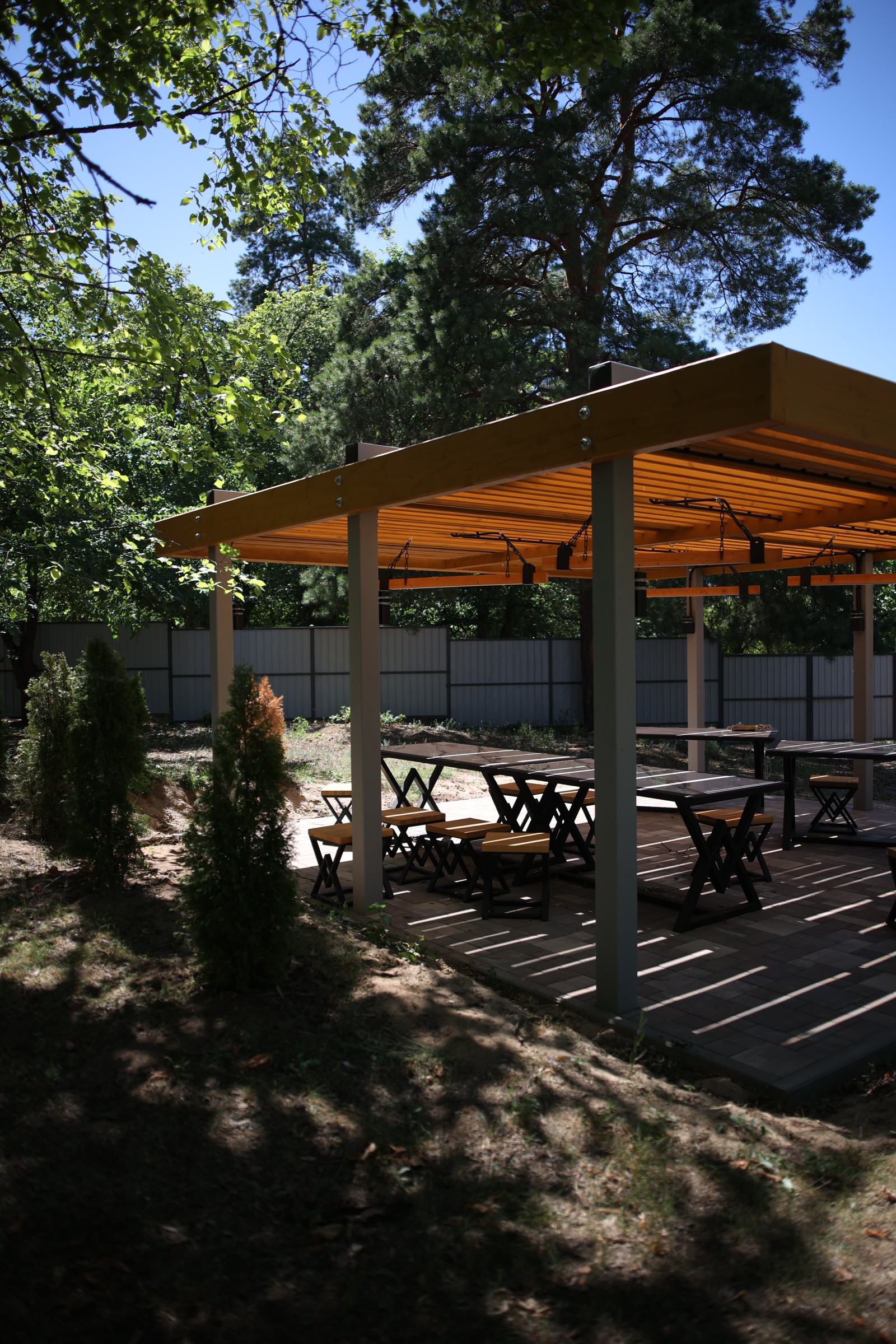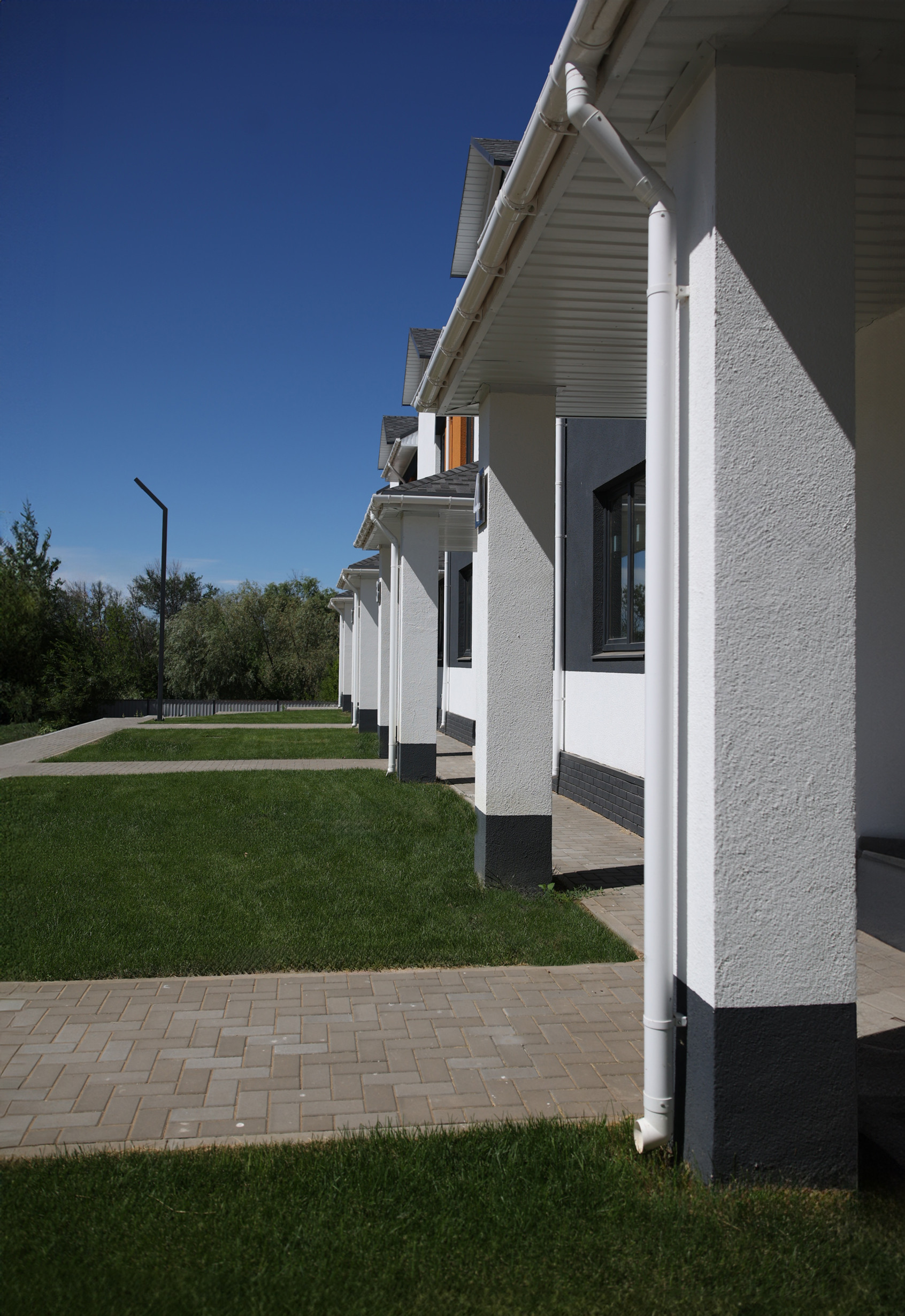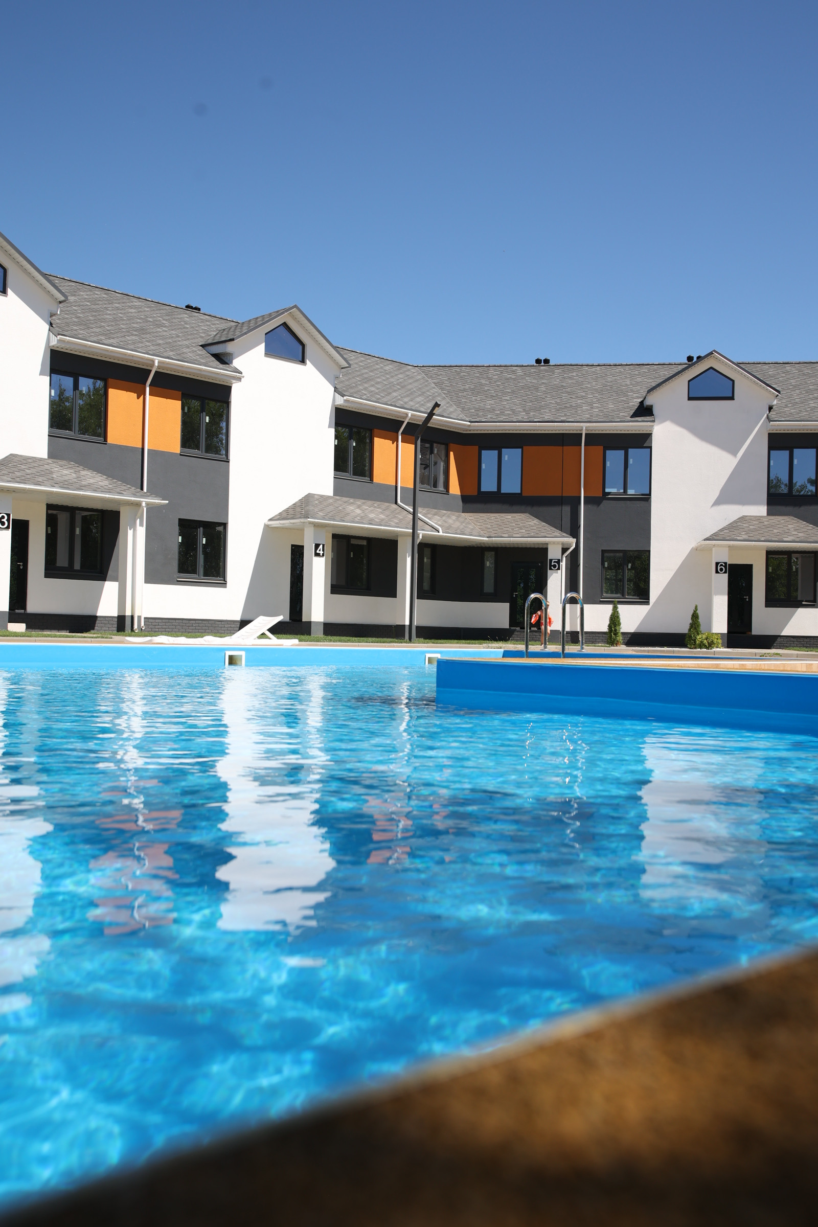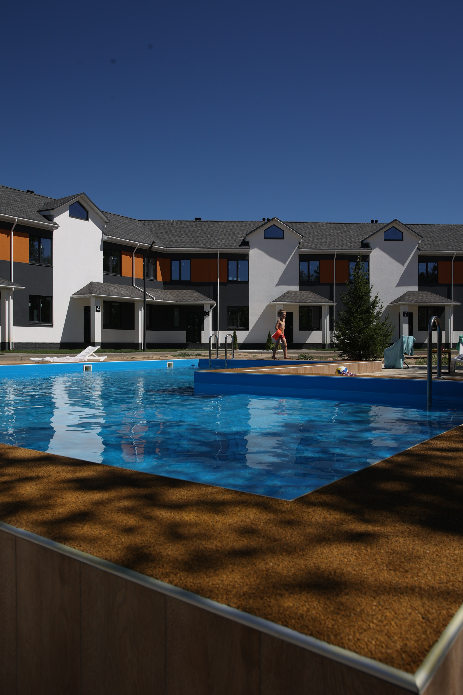 Благоустроенная закрытая территория с ландшафтным дизайном, на которой располагается бассейн, детская площадка, мангальная зона, дорожки, установлено круглосуточное видеонаблюдение. Свежий воздух, тишина, спокойствие, безопасность.