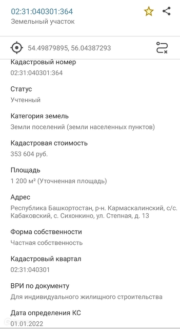 Кадастровый номер участка: 02:31:040301:364.