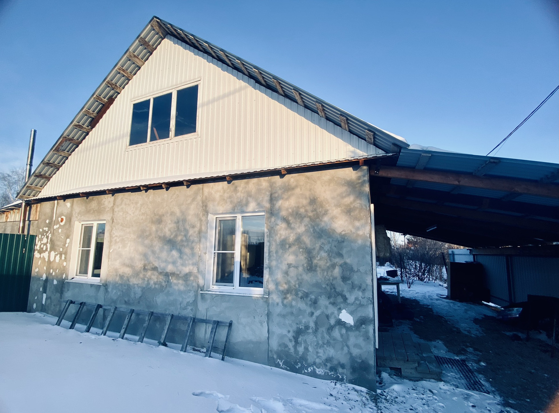Построен из отсевоблока, фасад отштукатурен.