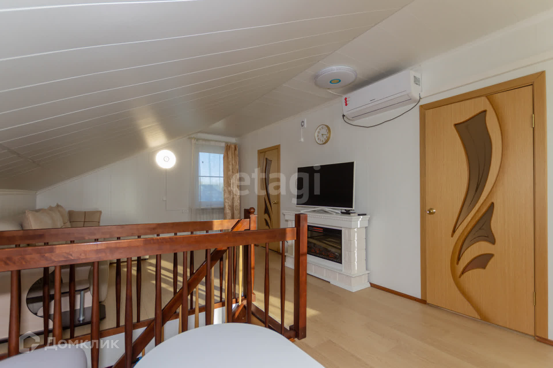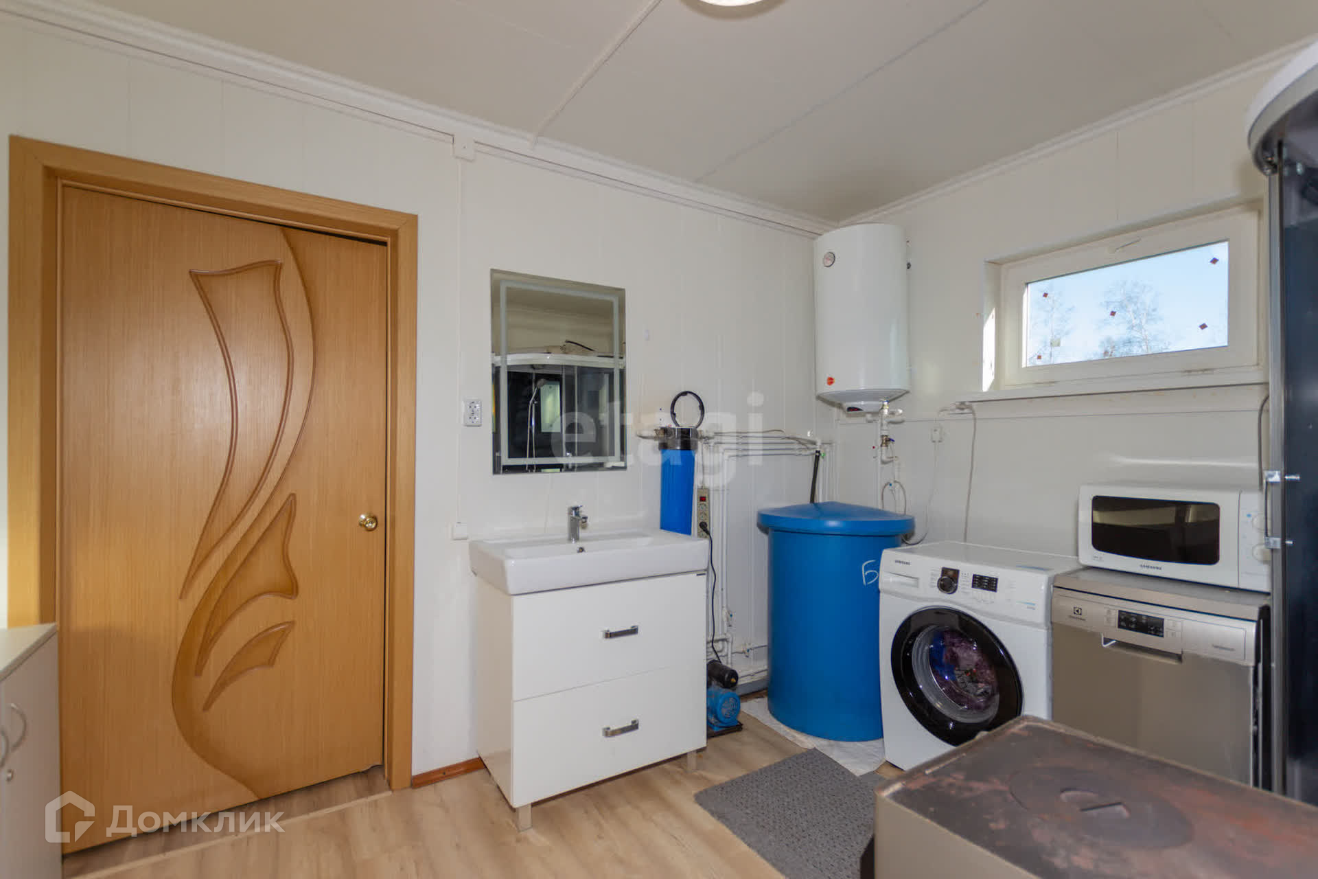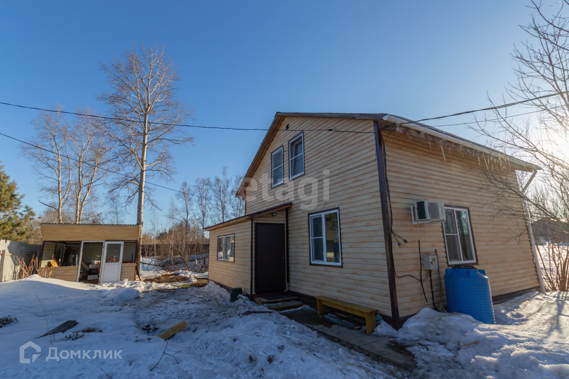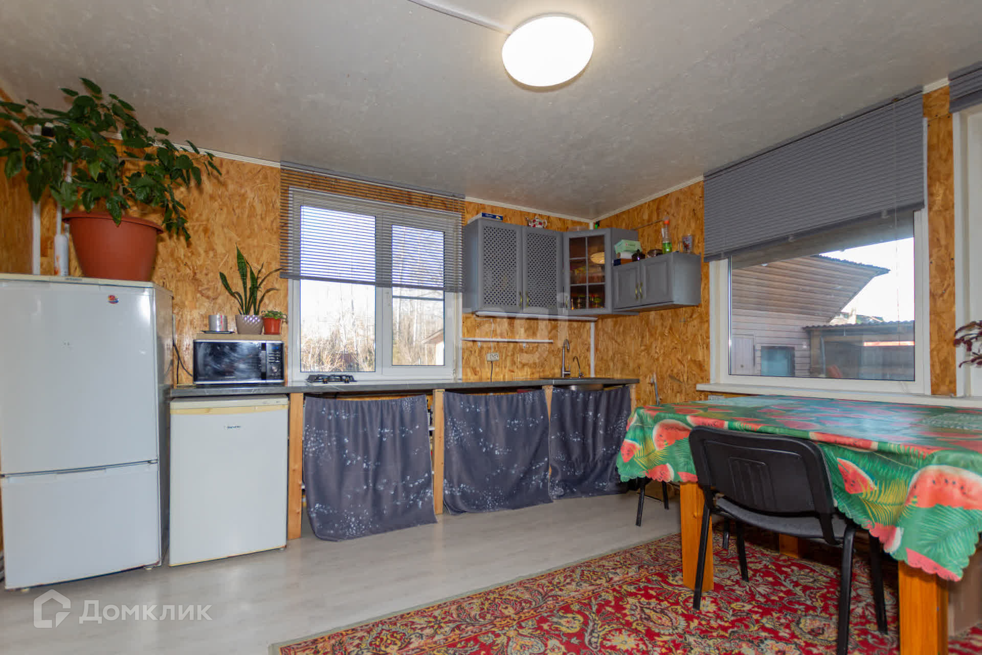 На стенах и потолке деревоплита, на полу ламинат, лестница из дерева. К дому пристроена утепленная веранда 40 кв.м с кухонной зоной.