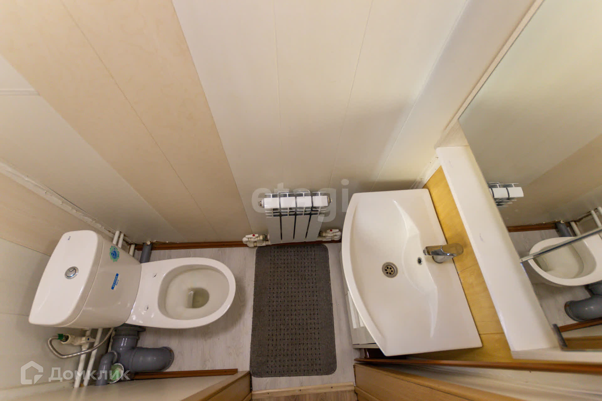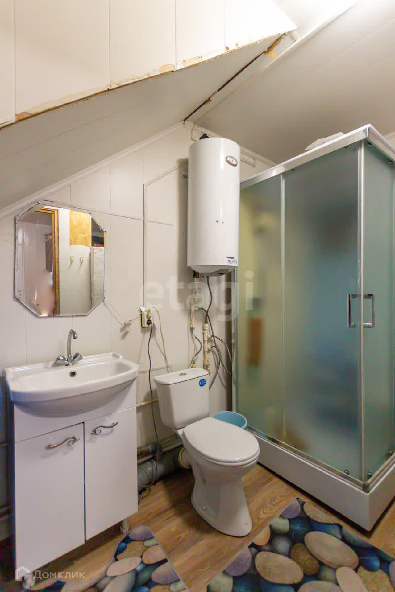 На стенах и потолке пластиковые панели, на полу ламинат, лестница из натуральной сосны.