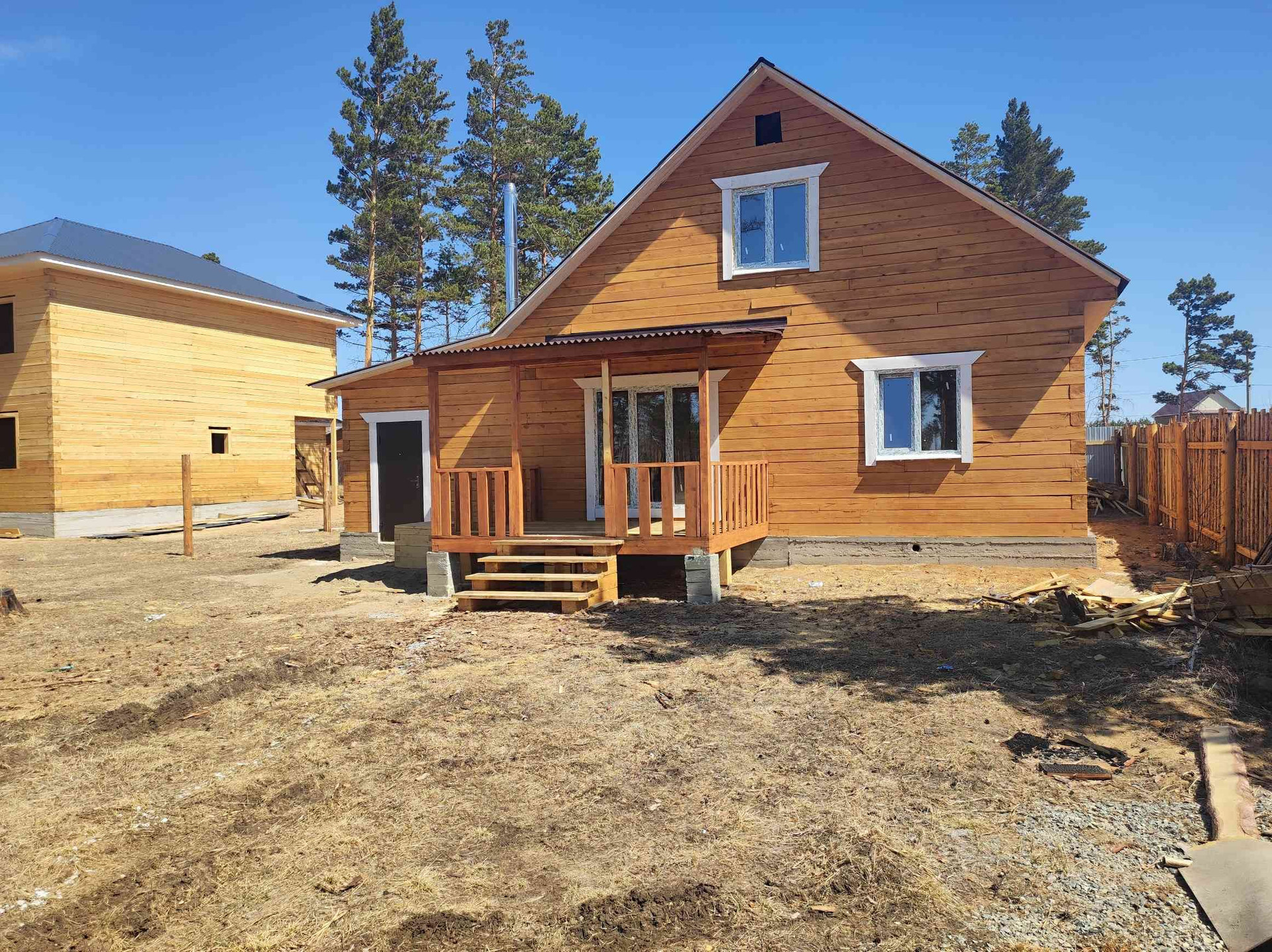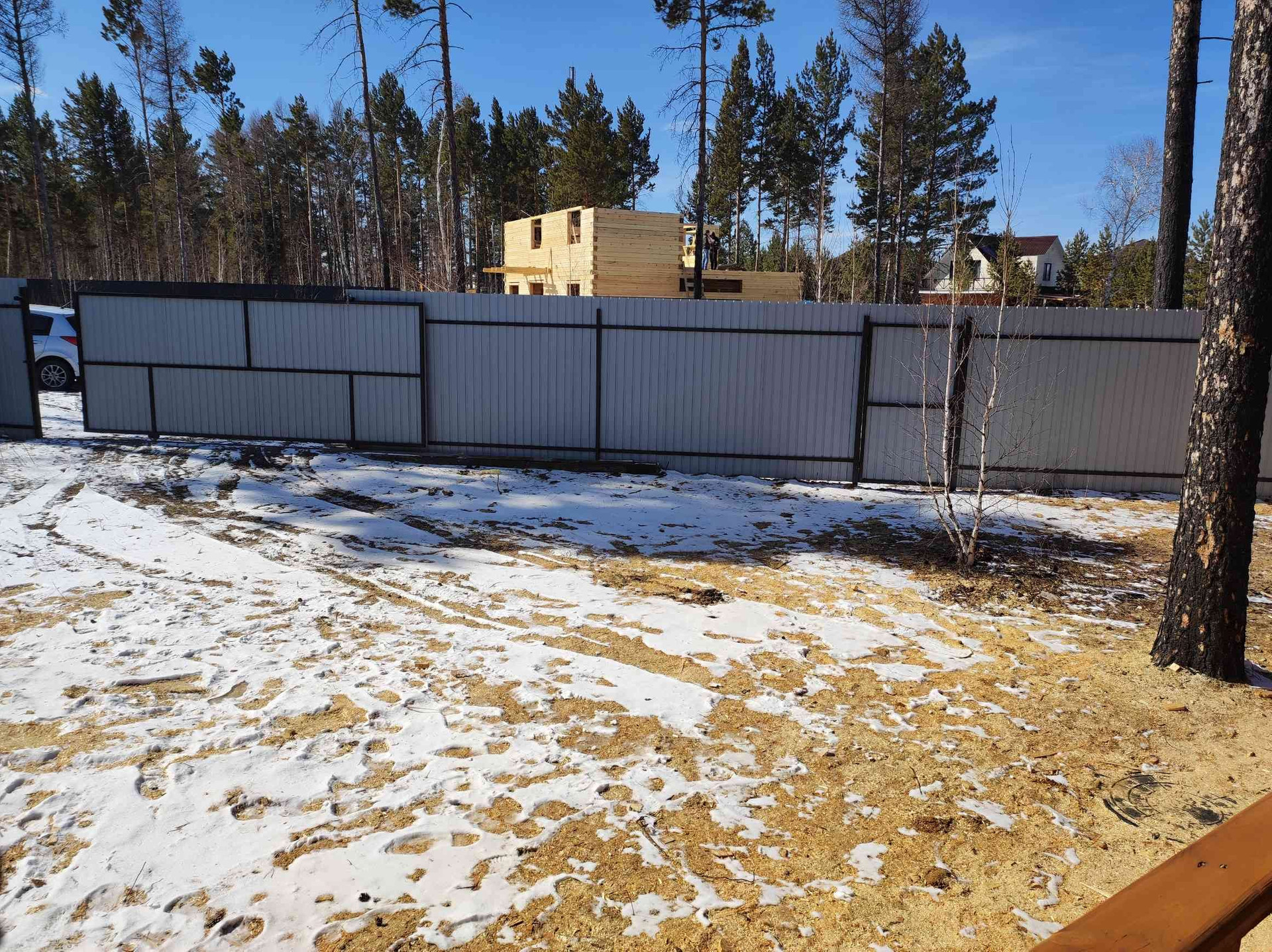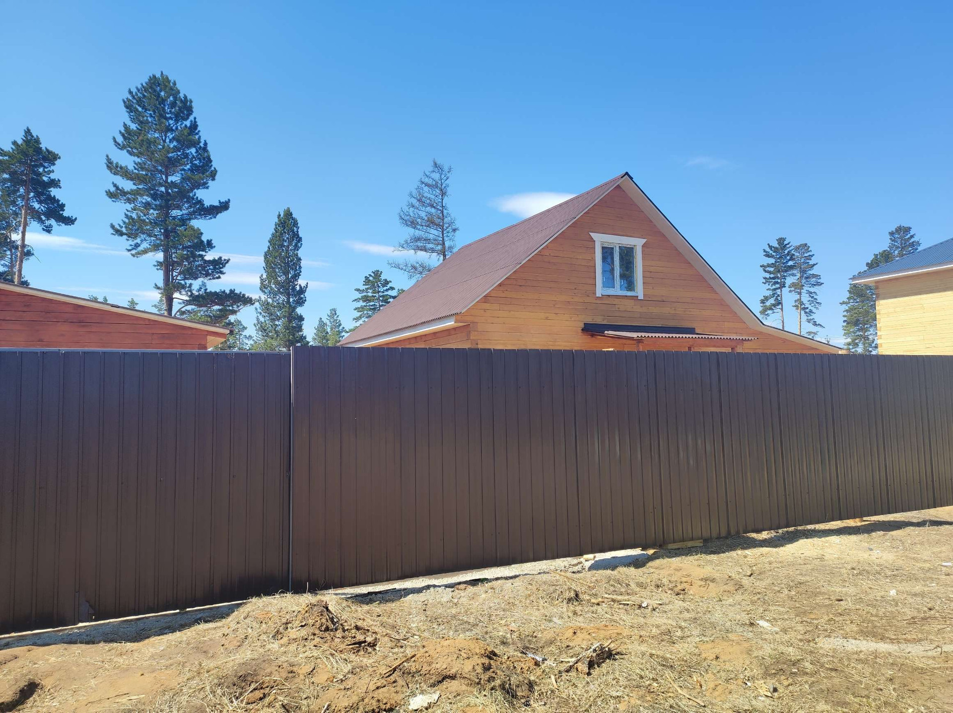 участок огорожен деревянным забором, лиц сторона профлист.