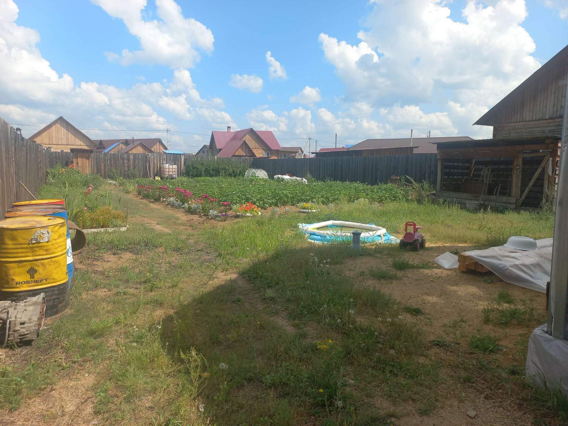 На участке: кусты смородины и малины, отлично плодоносит, ягода крупная и сладкая. А так же слива, вишня, яблоня. Земля хорошая, всё растёт.