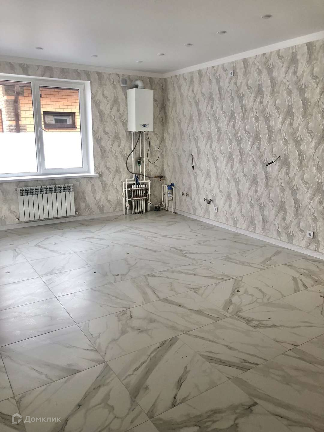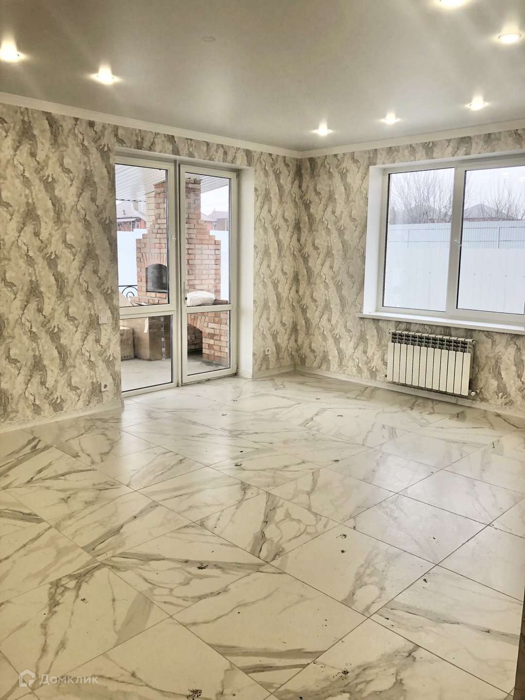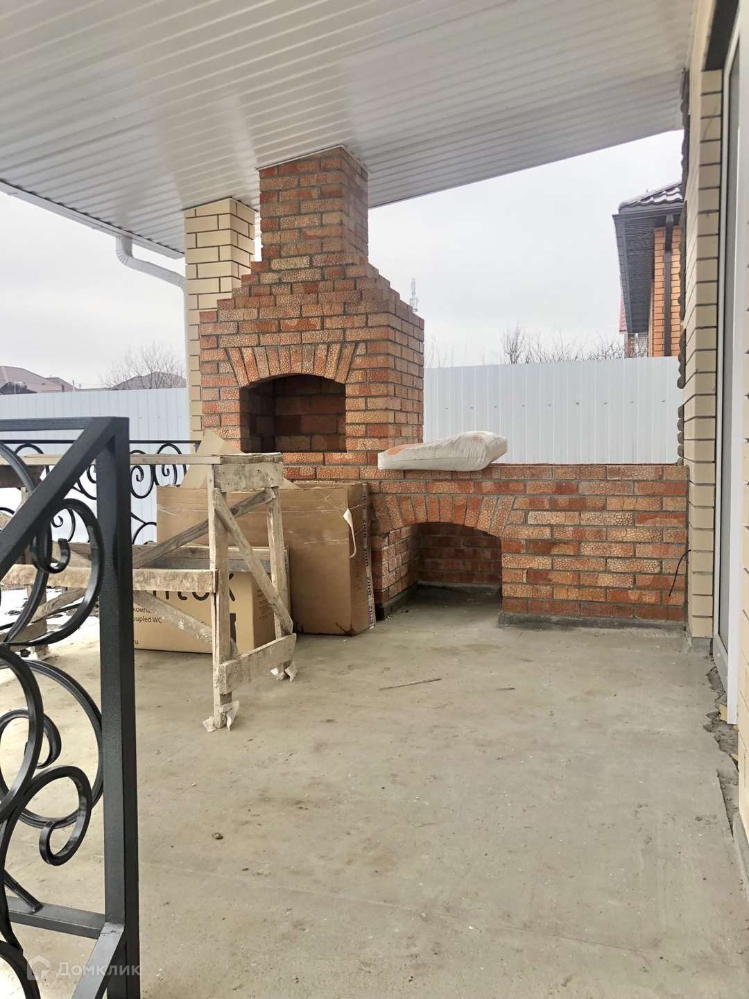 -Просторная кухня-гостиная с тёплым полом и современной плиткой на полу, натяжной потолок. Из кухни обустроен выход на террасу с кованным ограждением и зоной барбекю снабженной камином-мангалом из красного кирпича;