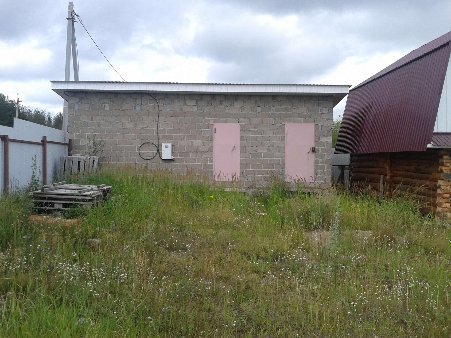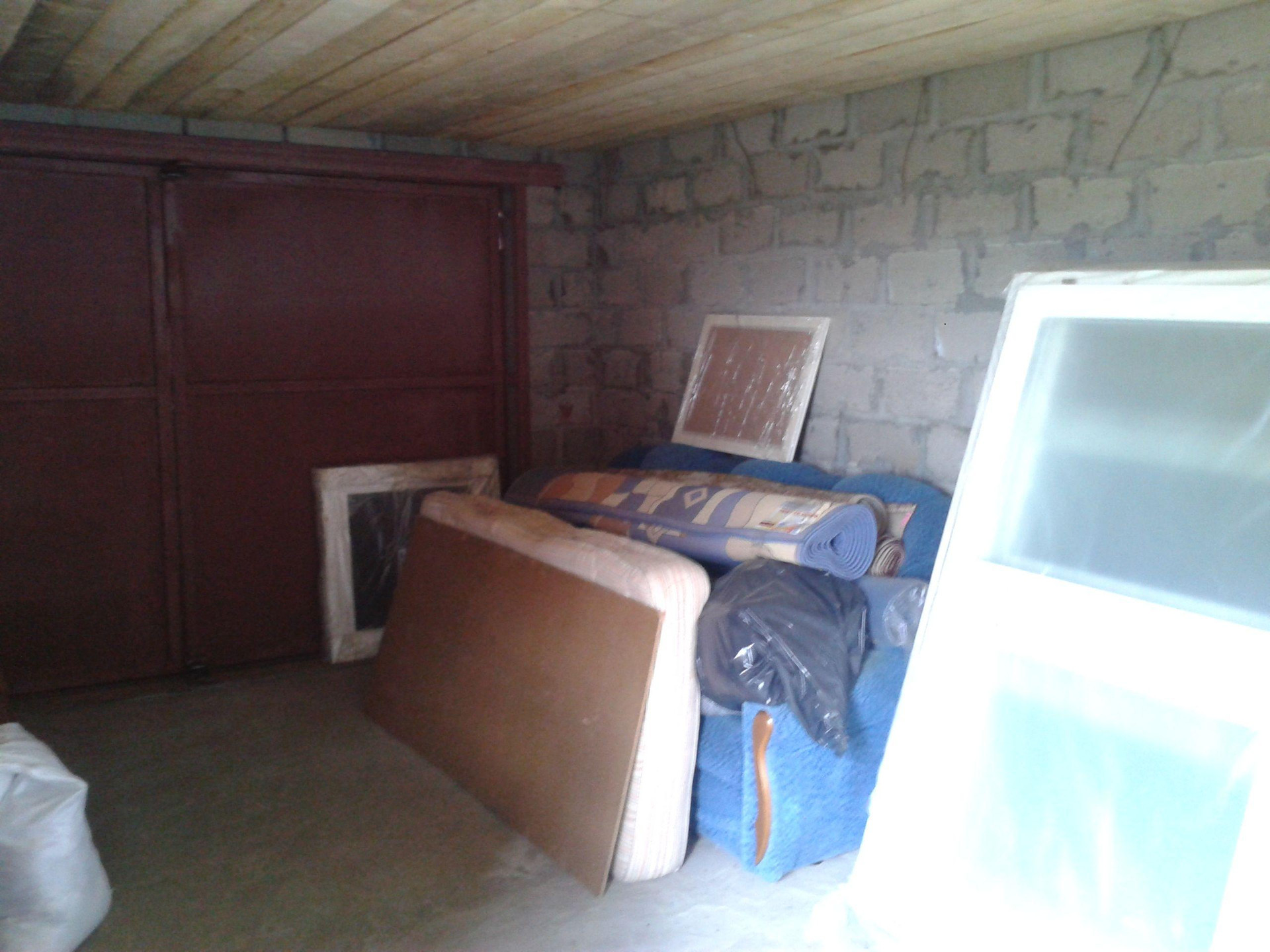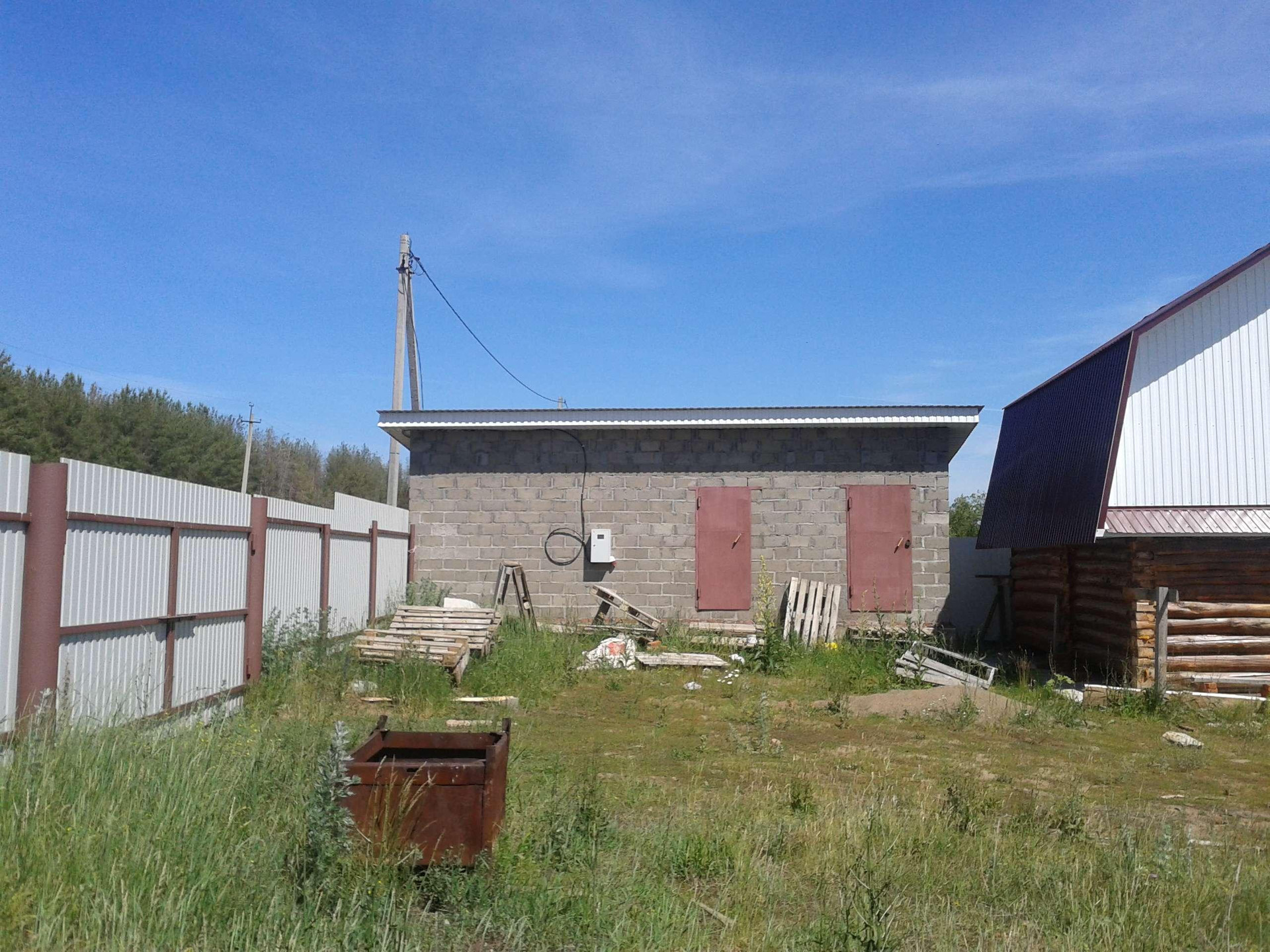Цементоблоки размер 4,5×9 разделён, есть дровник 4,5×2. Полы бетонные, потолок деревянный высота 3м