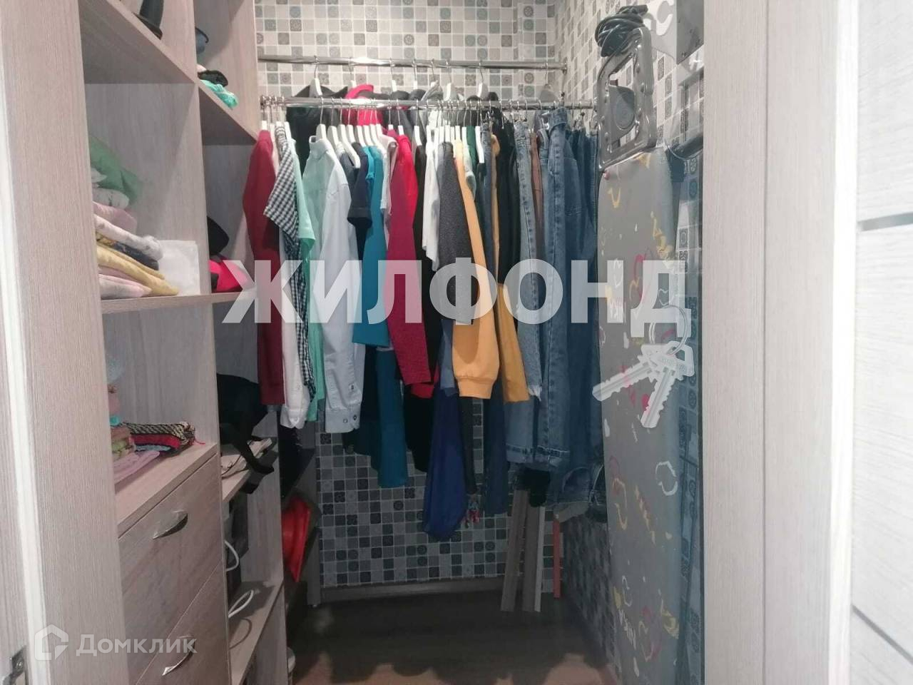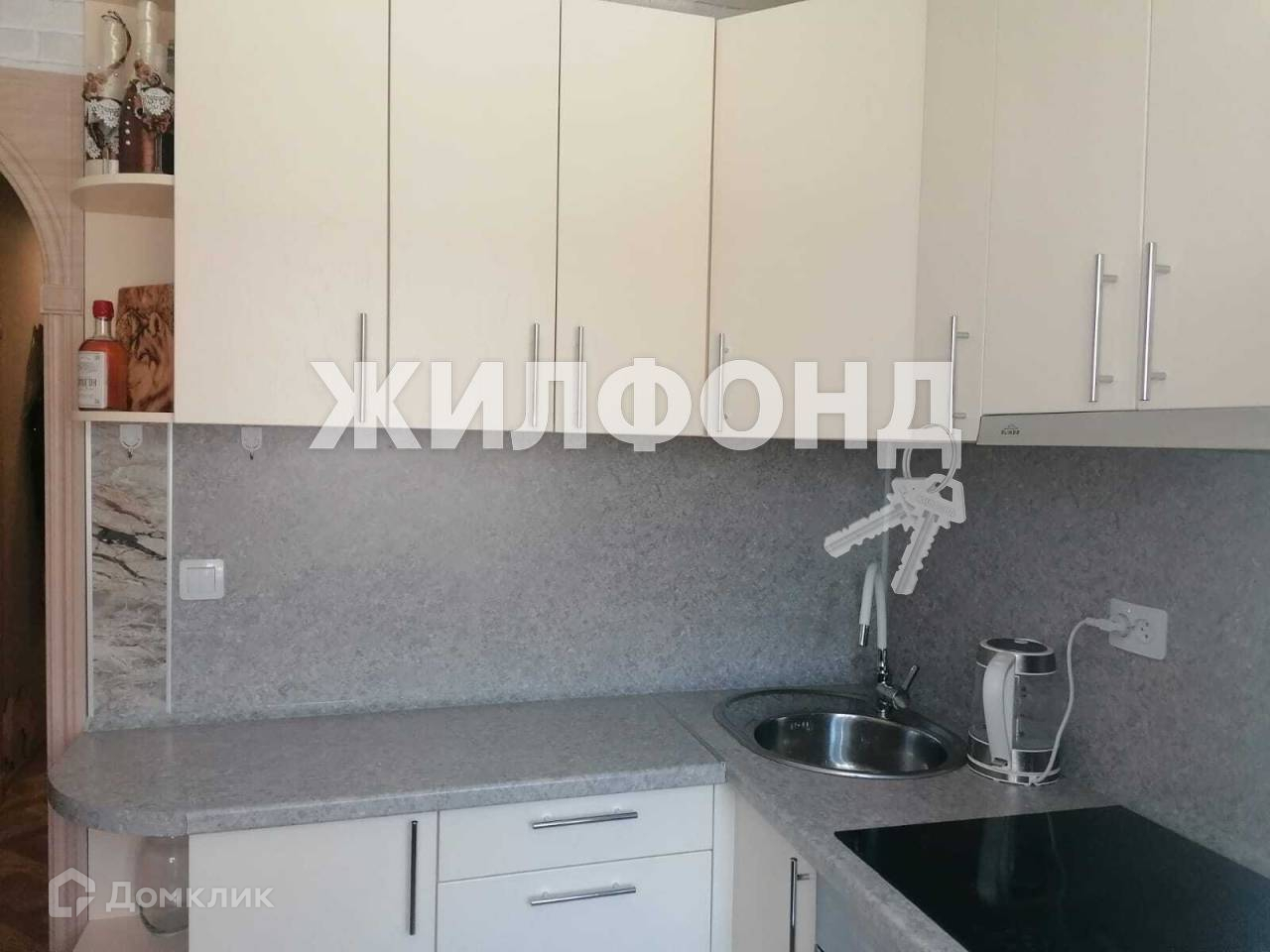 В кухне остается кухонный гарнитур со встроенной бытовой техникой и холодильник.