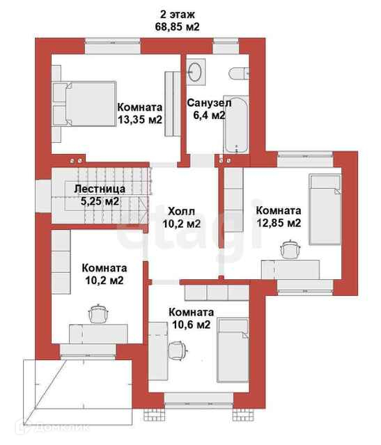 На втором этаже 4 спальные комнаты, санузел.