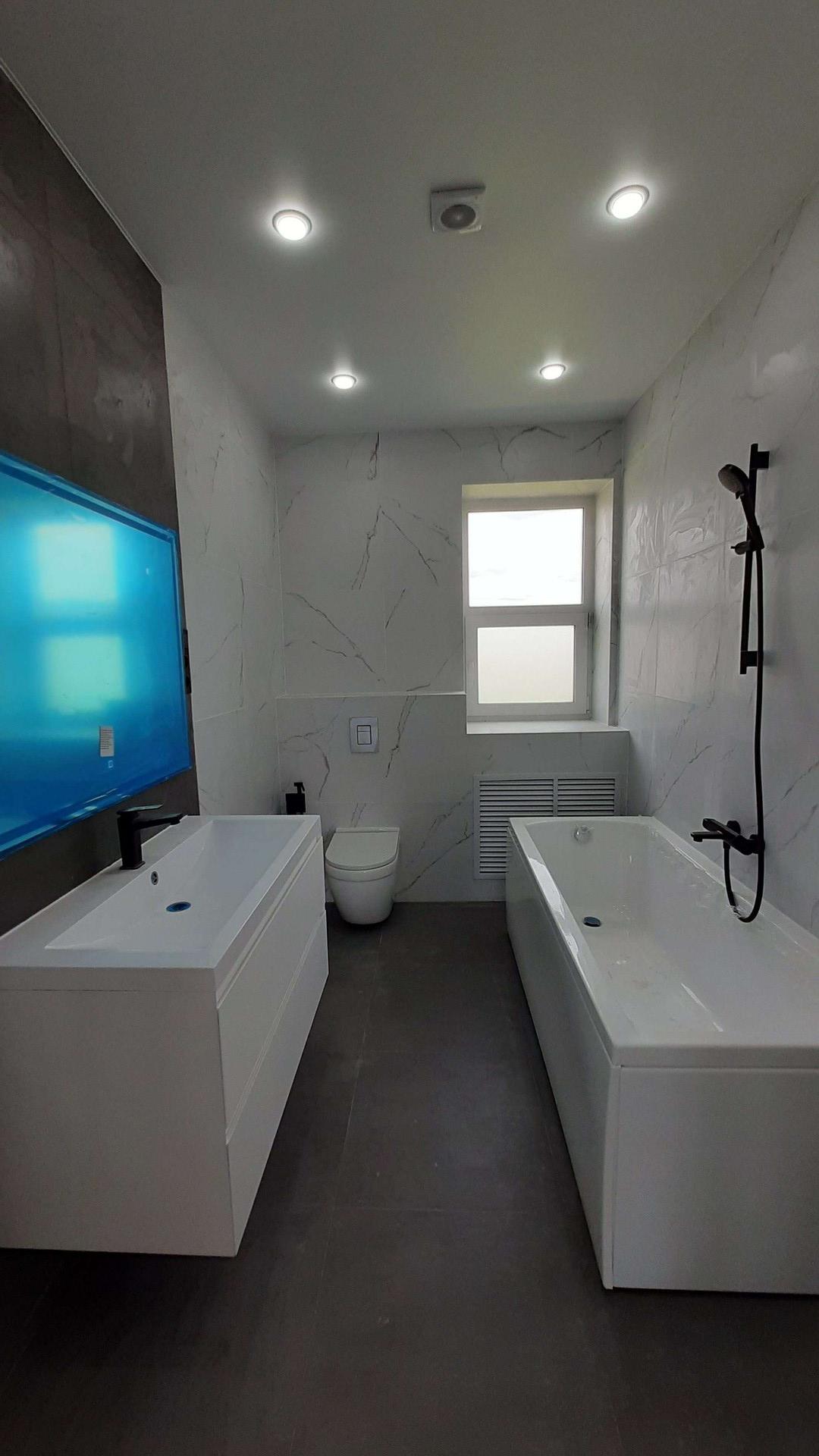 Сделан ремонт в СУ, натяжной потолок по всему дому, стены и пол подготовлены и выровненны.