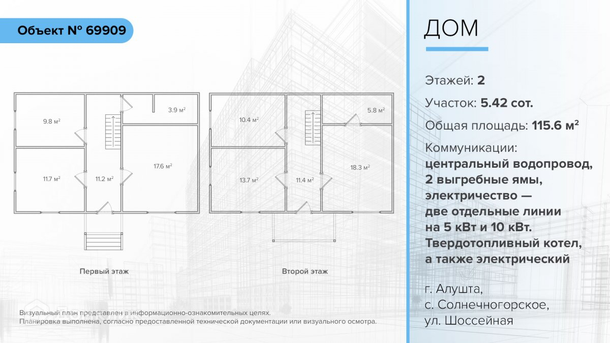 Общая площадь дома 115,6 м2. На участке 5,42 соток. Назначение земельного участка: индивидуальное жилищное строительство (ИЖС).